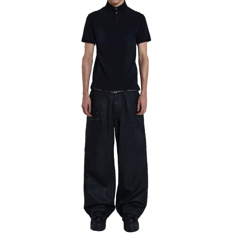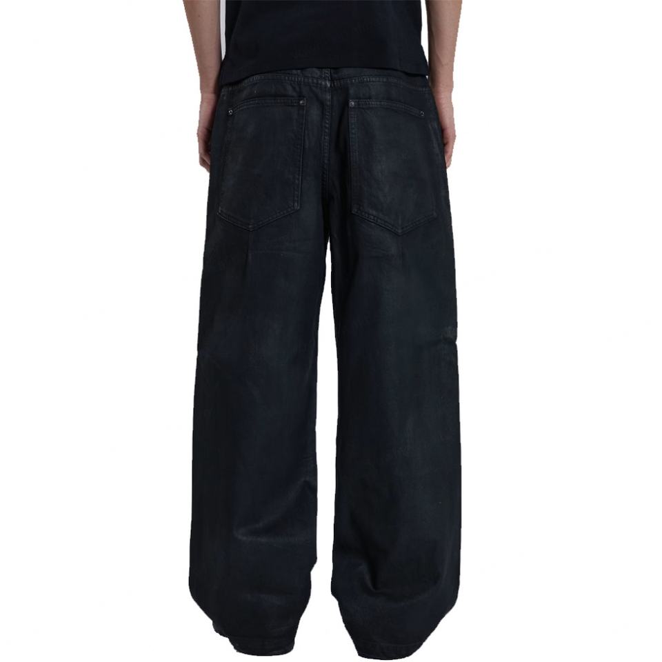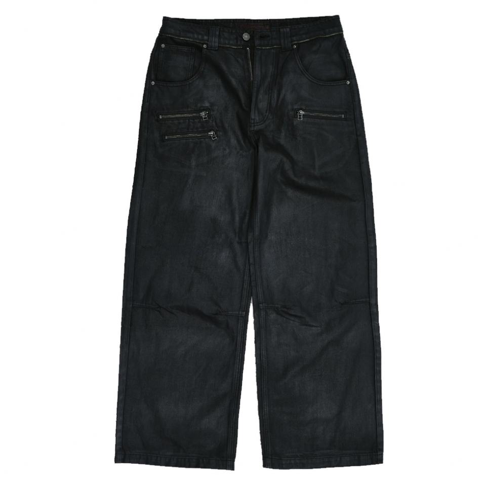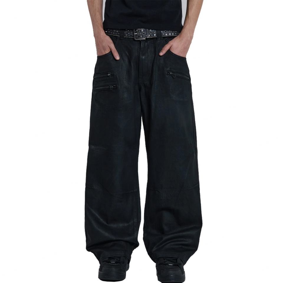 Jeans personnalisés modernes noirs enduits de cire, coupe ample, jambe large, pour hommes
