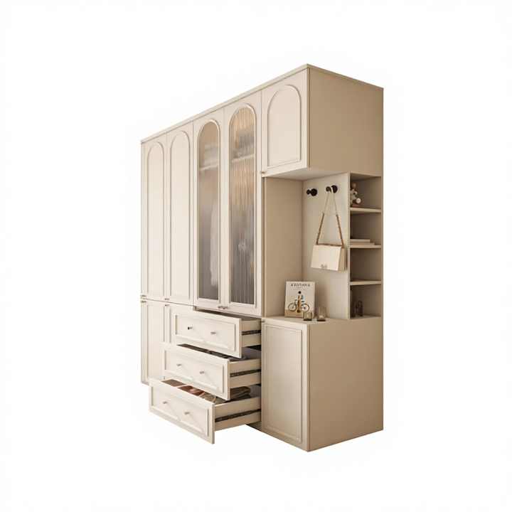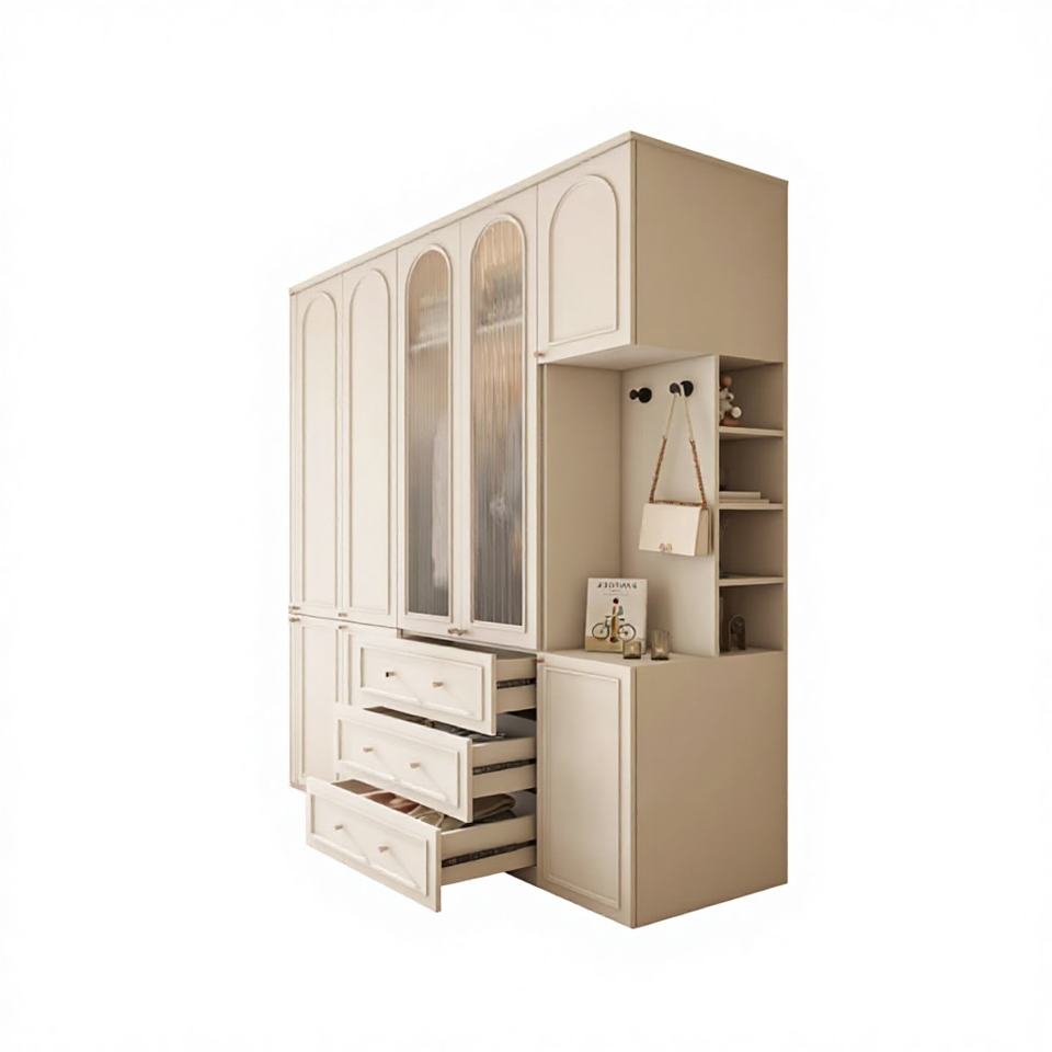 Armoire intégrée moderne sur mesure en MDF de style français avec portes cintrées et tiroirs à fermeture douce pour chambre d'appartement et de villa