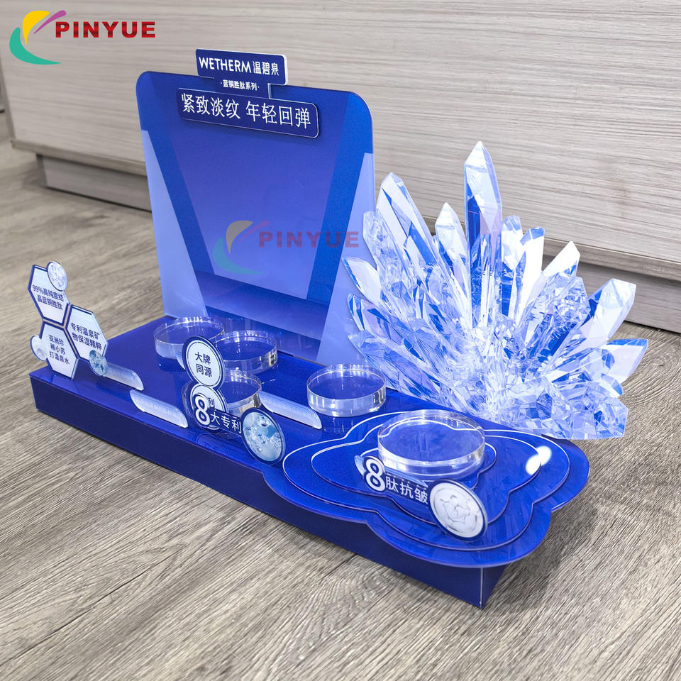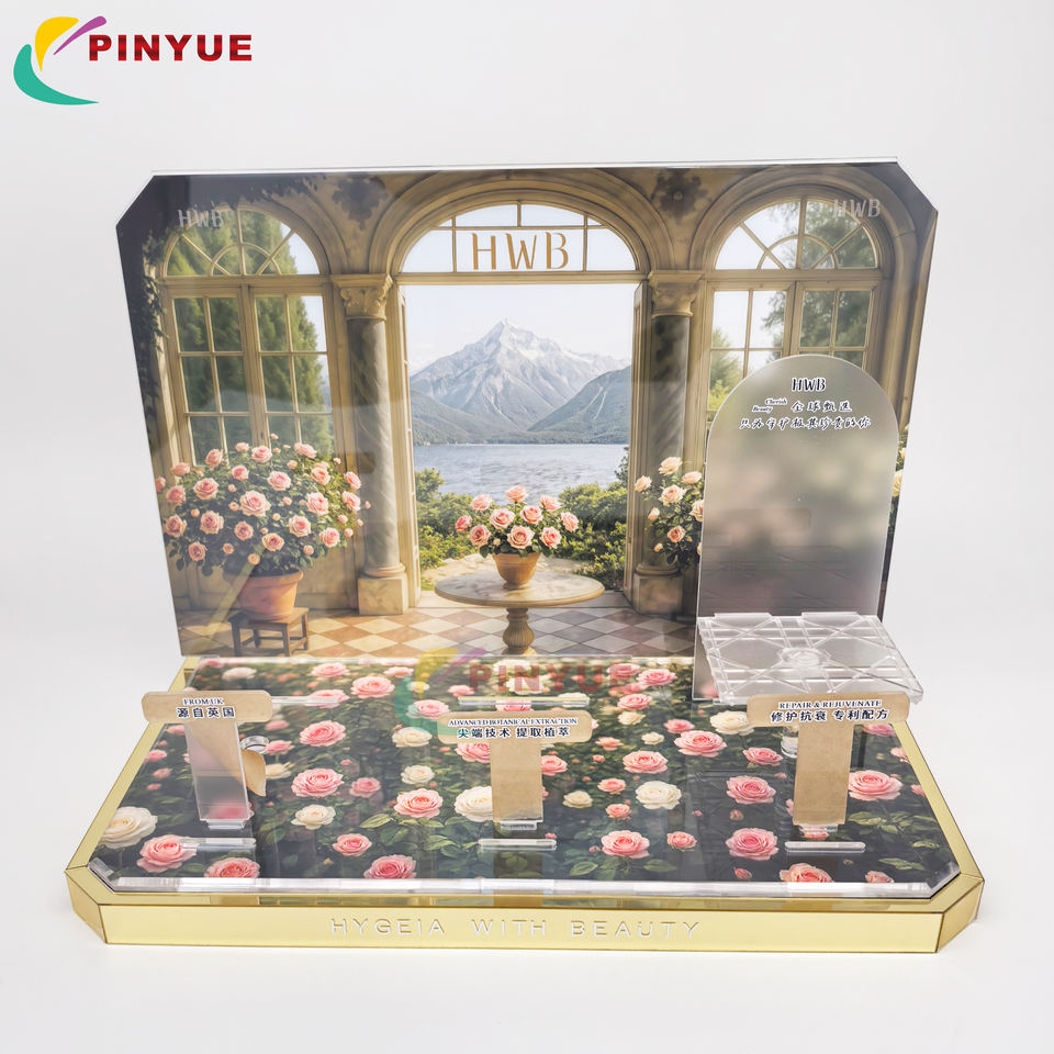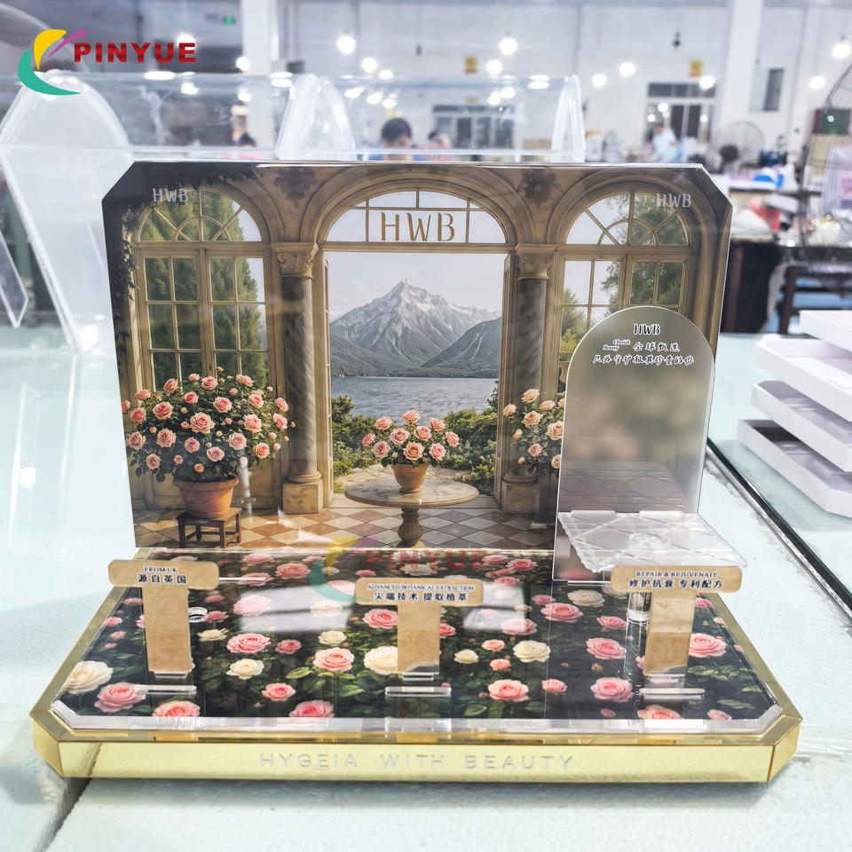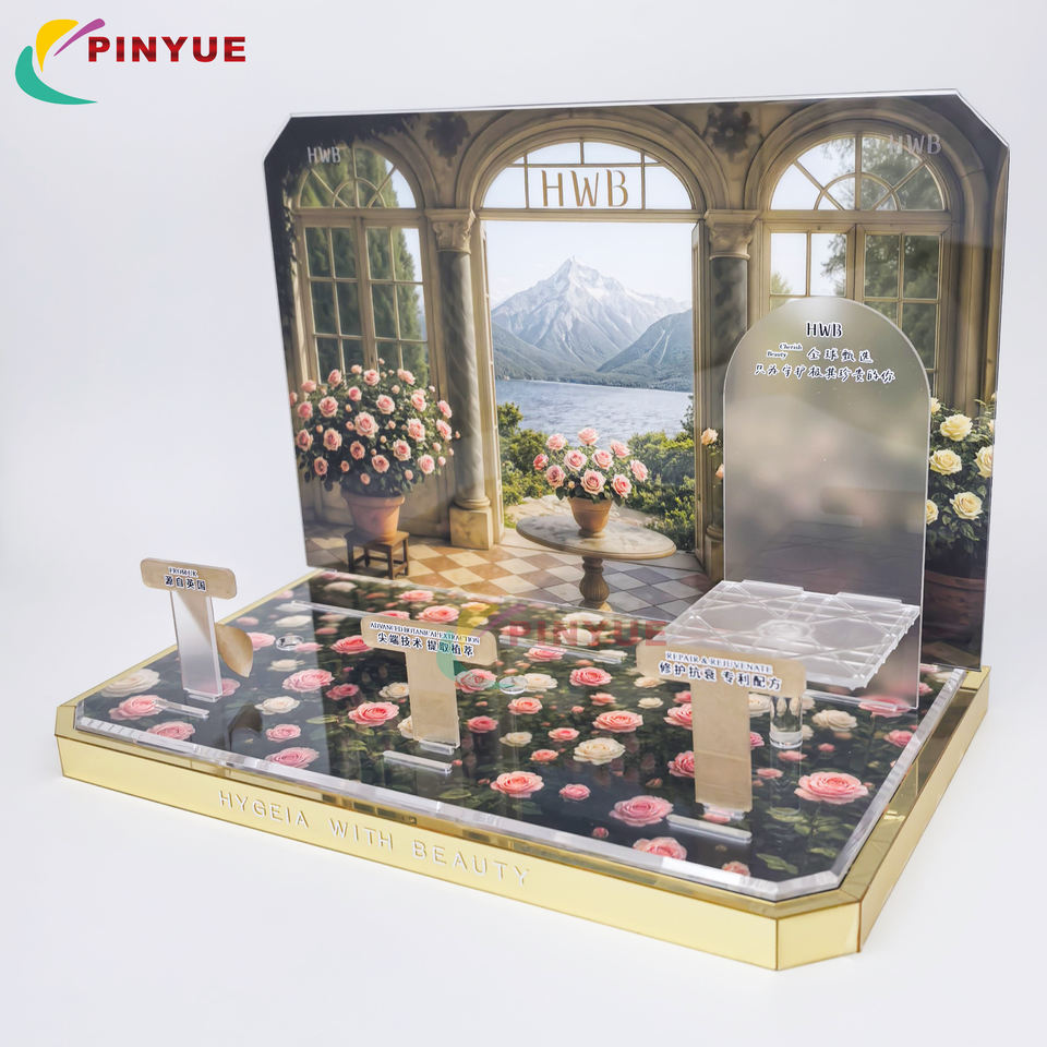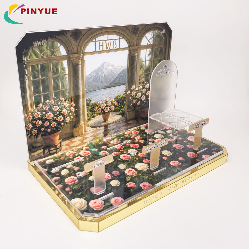Présentoir de Comptoir Moderne Personnalisé en Acrylique et Métal Doré avec Petits Crochets et Étagère pour Maquillage et Fleuriste