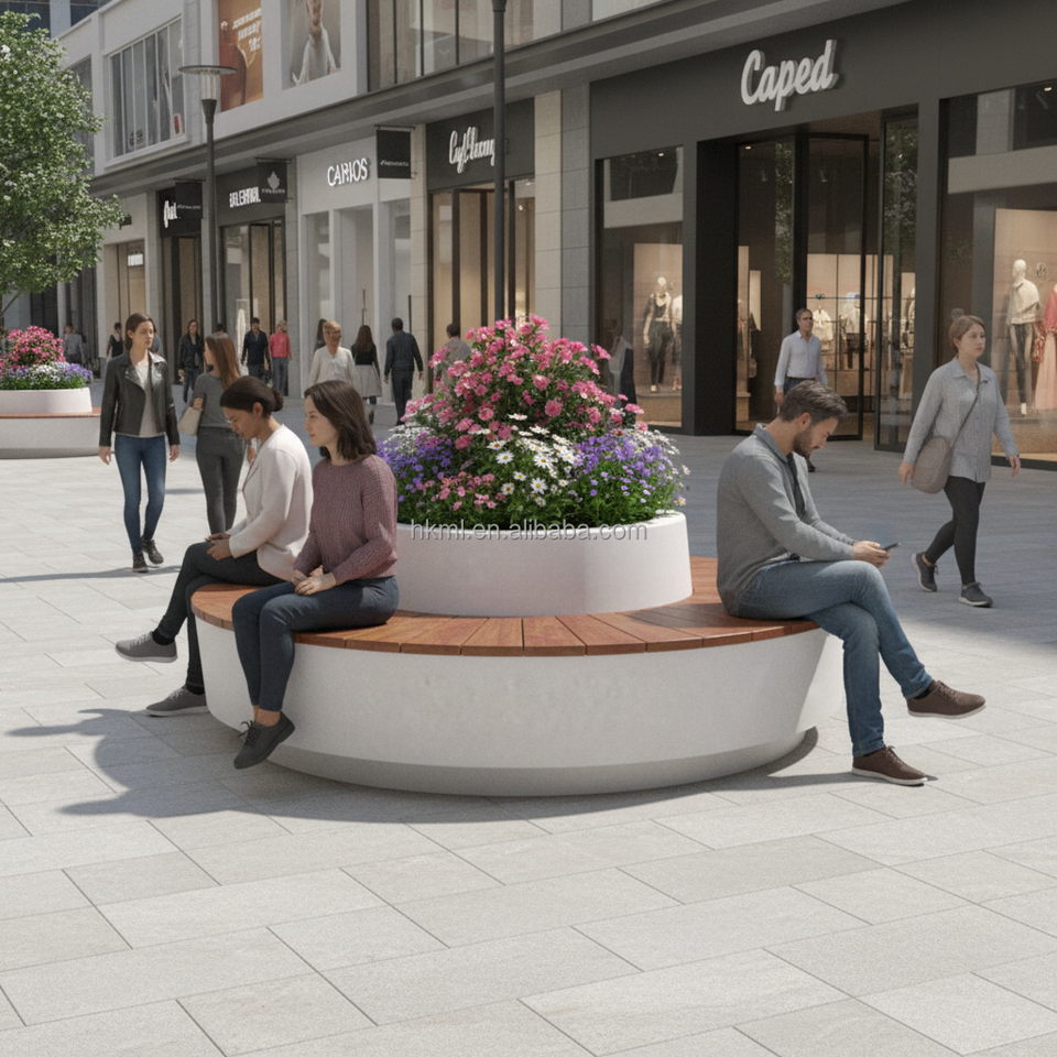 Banc de jardinage circulaire moderne en GRC sur mesure avec lattes en teck durables pour les espaces de loisirs extérieurs des parcs et des centres commerciaux