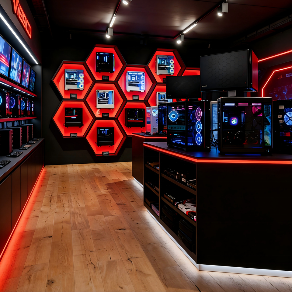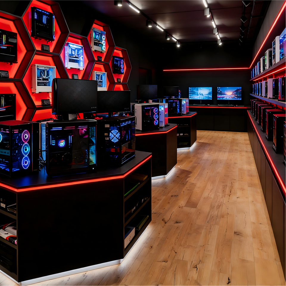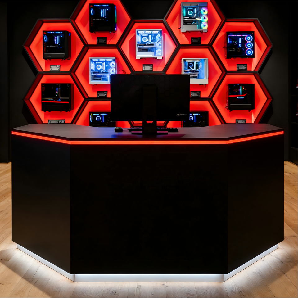 Vitrine d'exposition en verre moderne sur mesure avec éclairage LED pour magasin d'ordinateurs et de jeux vidéo