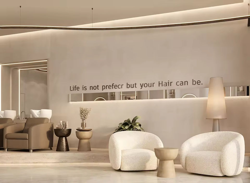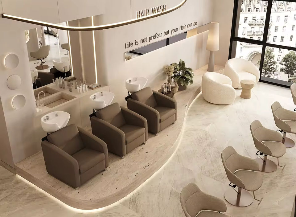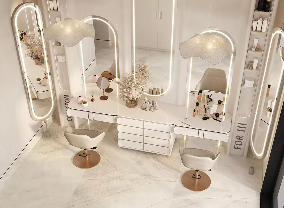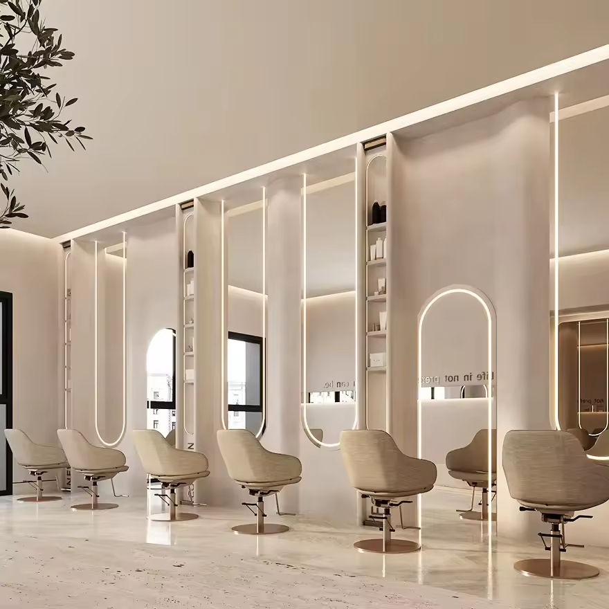 Conception personnalisée de salon de coiffure moderne, aménagement personnalisé de salon de barbier, poste de coiffage en bois avec miroir