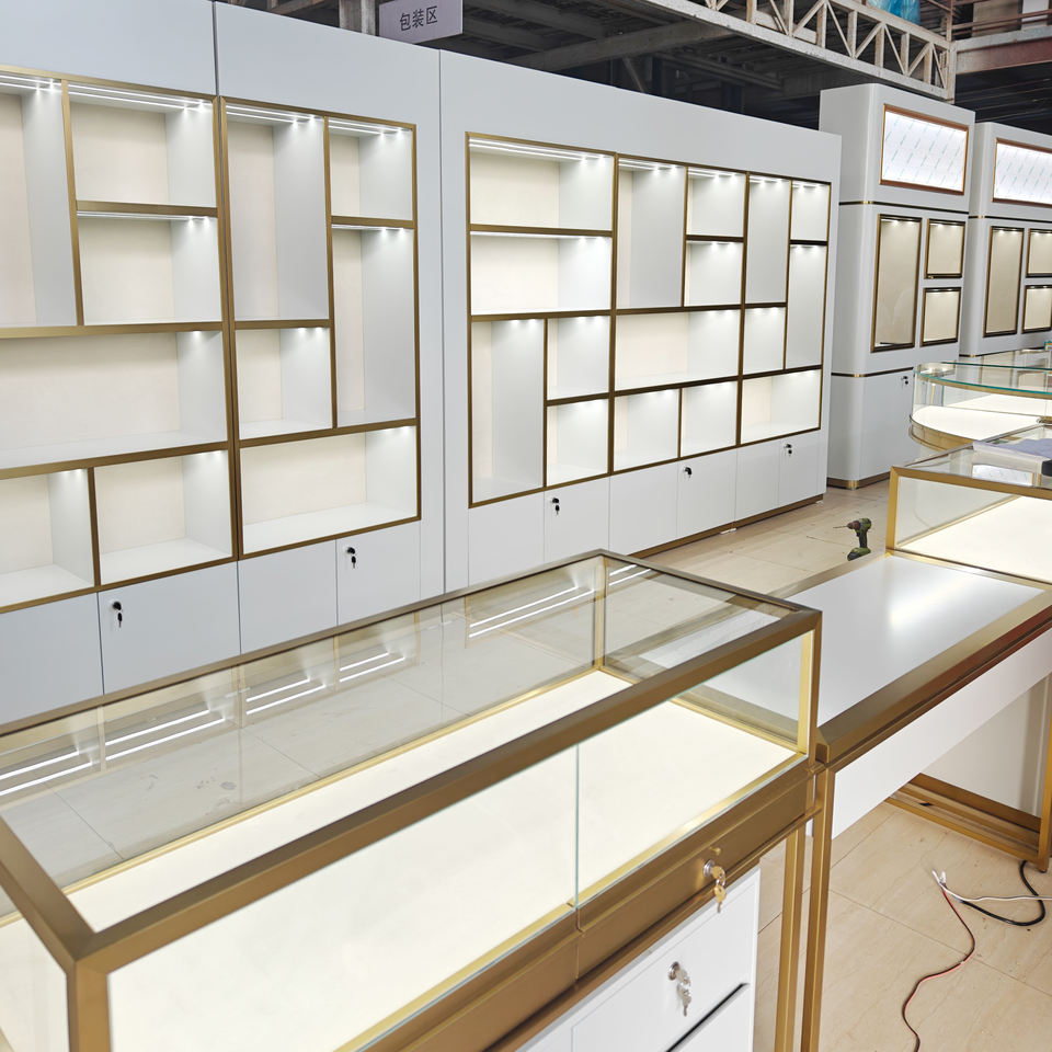Vitrine à bijoux moderne de luxe sur mesure avec éclairage LED, présentoir mural en verre, cadre doré, design de magasin de bijoux