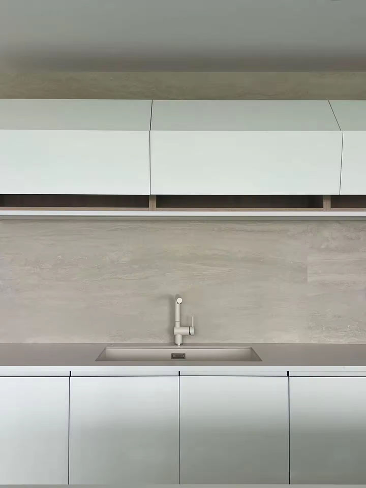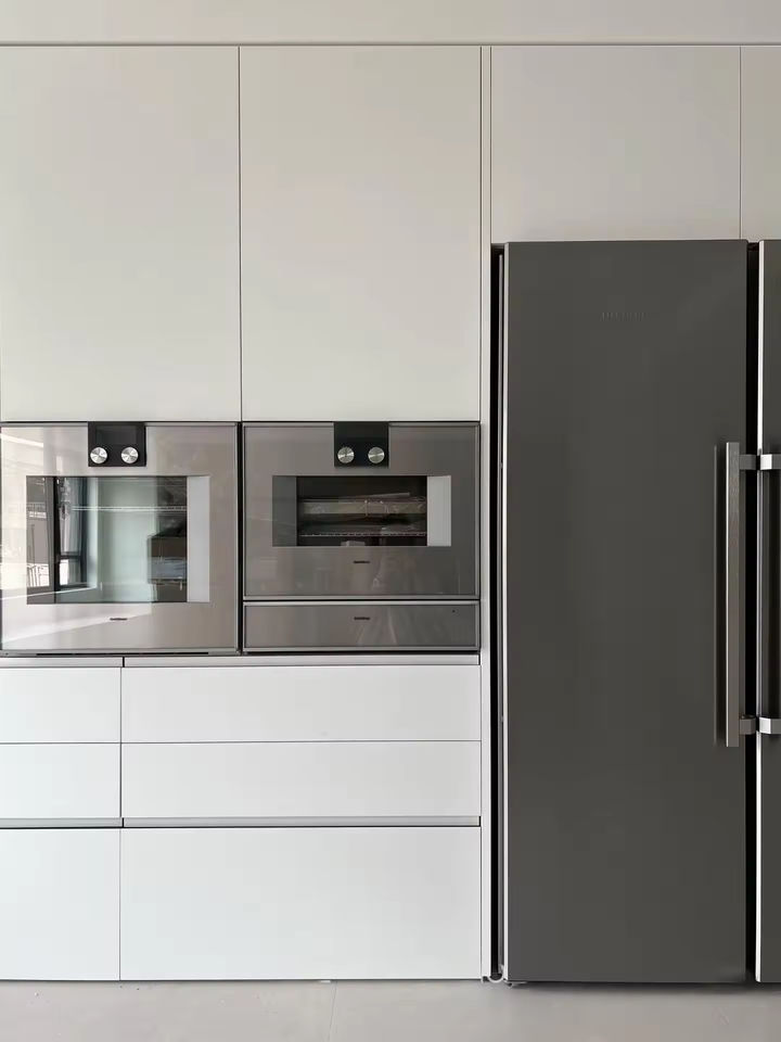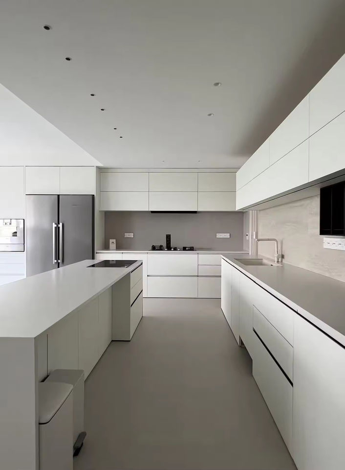 Ensemble d'armoires de cuisine blanches de style moderne minimaliste personnalisé avec îlot, finition laquée haute brillance, bois massif de luxe
