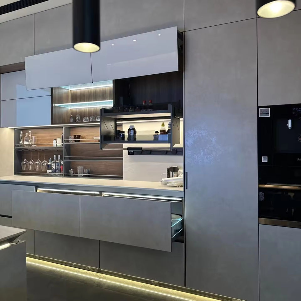 Cuisine moderne sur mesure de style luxueux en bois massif avec îlot, matériaux de qualité supérieure pour des espaces de cuisine élégants