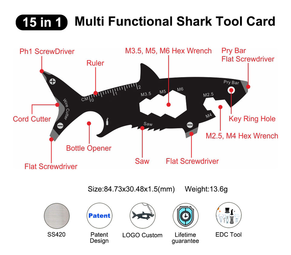 Porte-clés multifonctionnel personnalisé en acier inoxydable, accessoires en forme de requin, multi-outils avec logo laser, cadeau porte-clés