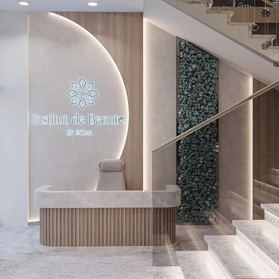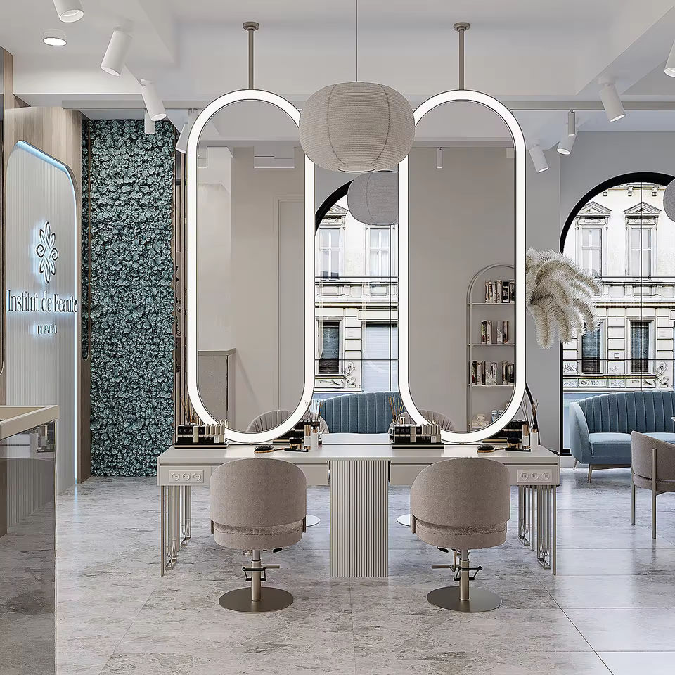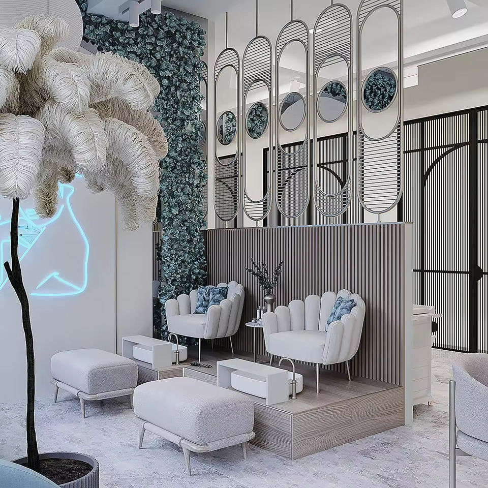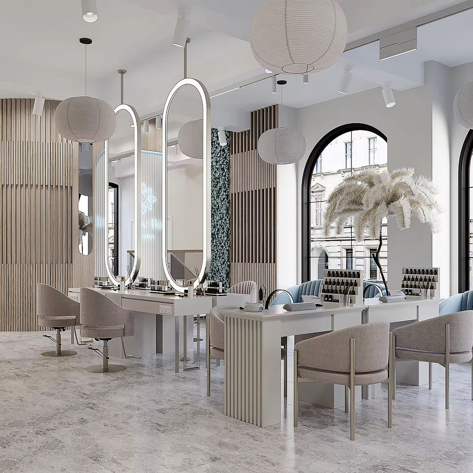 Conception d'intérieur personnalisée pour salon de manucure, mobilier sur mesure, personnalisation complète de l'espace commercial, service d'aménagement de salon