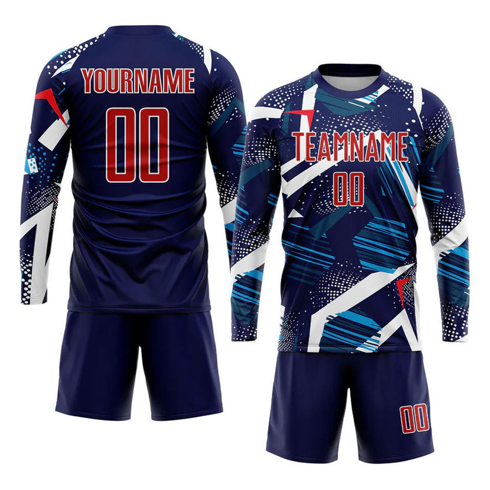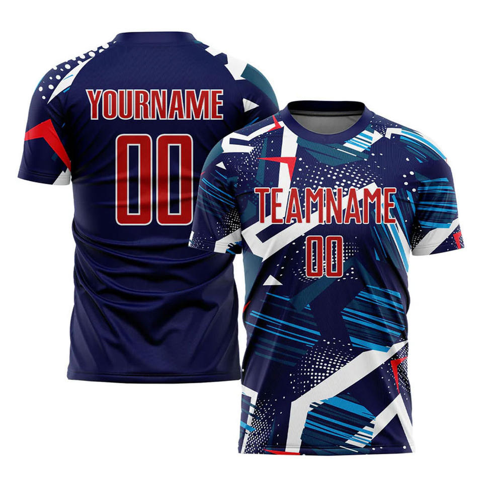 Maillot de football personnalisé bleu marine avec motif géométrique multicolore, équipement d'équipe sublimé à séchage rapide, short inclus