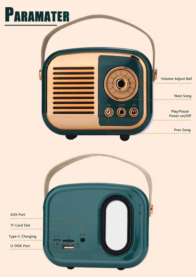 Radio portable vintage au design personnalisé, ancienne mode, belle, classique, avec lecteur radio FM auxiliaire, haut-parleur rétro sans fil Bluetooth, boîte rétro