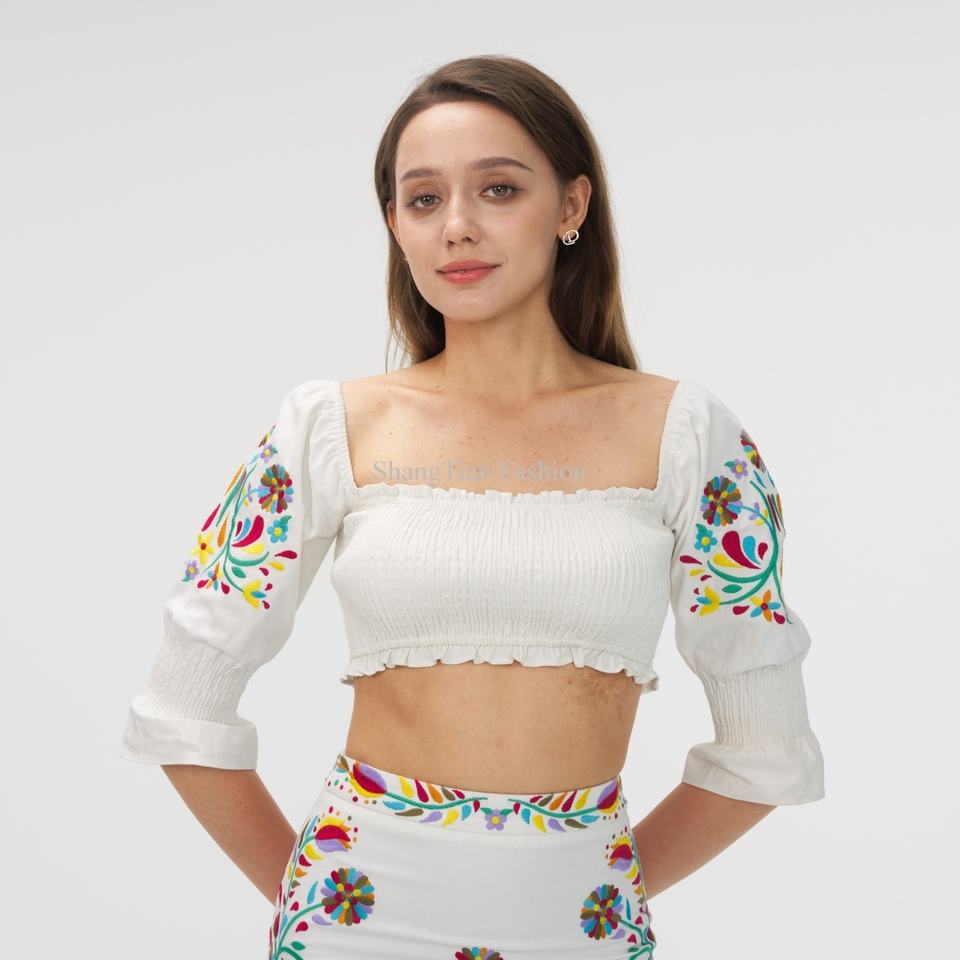 Nouveaux ensembles de crop tops à volants pour femmes, design personnalisé, avec broderies florales