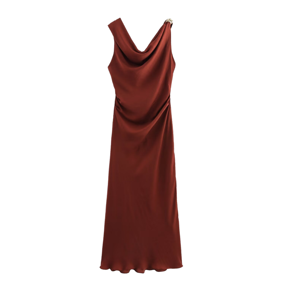 Nouveau printemps personnalisé femmes longue robe froncé couleur marron à la mode jupes anneau doré décrire coupe ajustée sans manches Midi