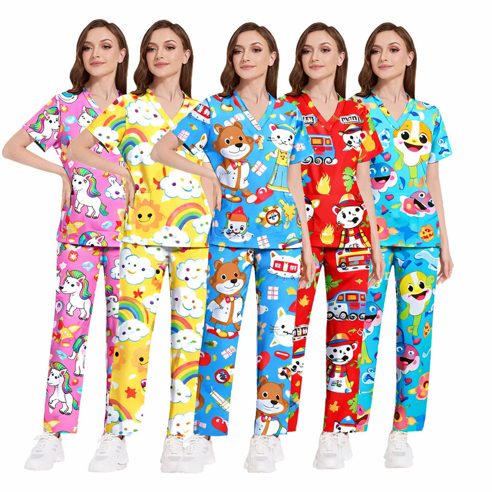 Ensemble de blouses personnalisées pour femmes avec imprimé de dessins animés, haut à col en V à manches courtes et pantalon, uniforme médical pour les infirmières et les professionnels de la santé