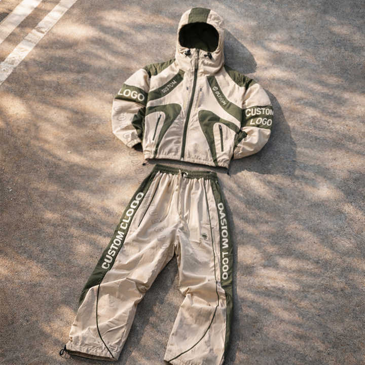 Ensemble survêtement en nylon personnalisé pour homme, veste zippée légère en patchwork et pantalon de survêtement, survêtement streetwear en polyester imperméable