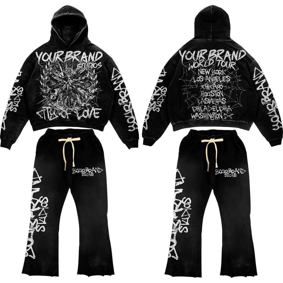 Survêtement personnalisé OEM lavé à l'acide, ensemble deux pièces brodé, sweat à capuche et pantalon pour streetwear ou mode décontractée