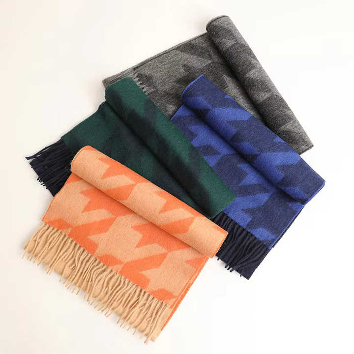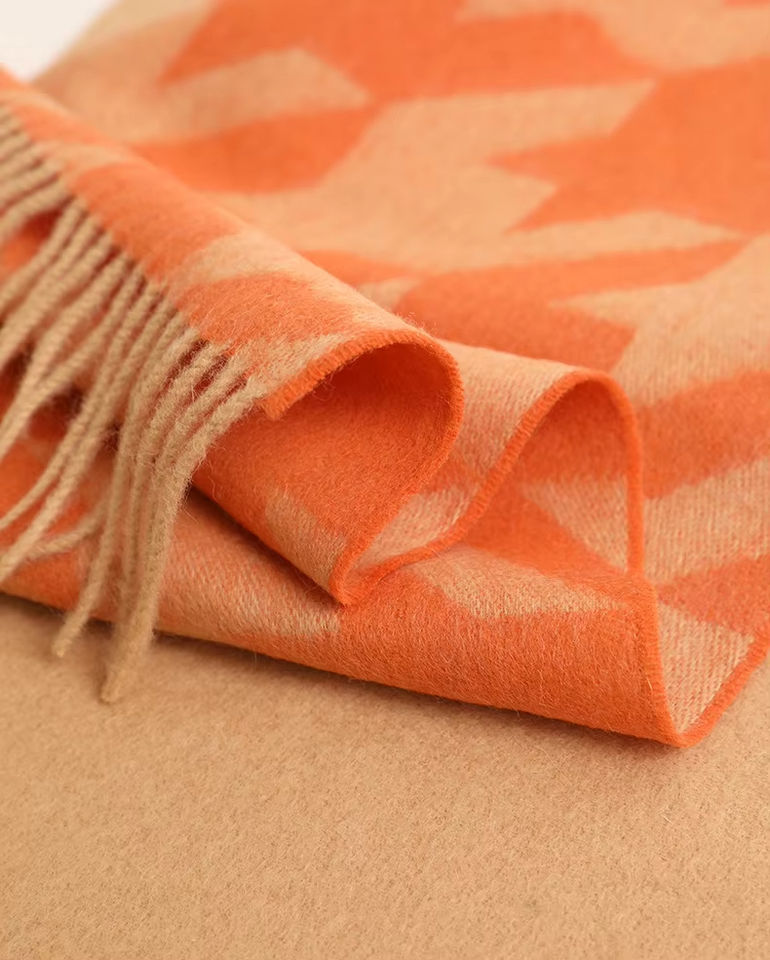 Écharpe en laine à motif pied-de-poule ondulé double face, impression géométrique et pompons, avec service de personnalisation de logo OEM pour cadeaux d'entreprise