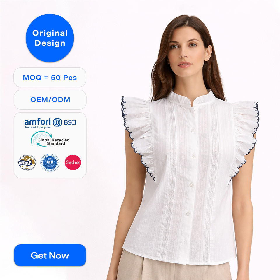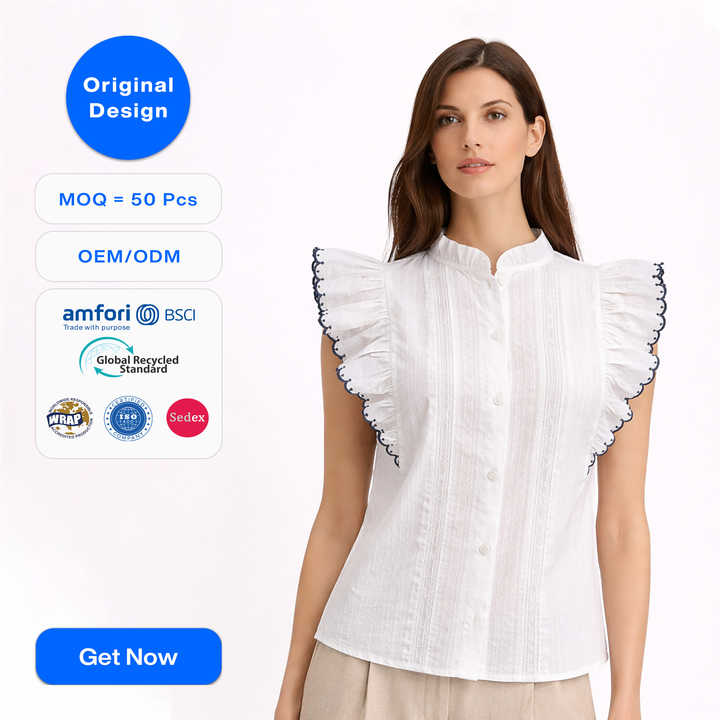 Chemisier Femme Personnalisé OEM en Popeline à Manches Volants, Col Montant, Boutons sur le Devant, Bordure en Dentelle, Tissu Léger et Élégant pour l'Été, Haut Décontracté
