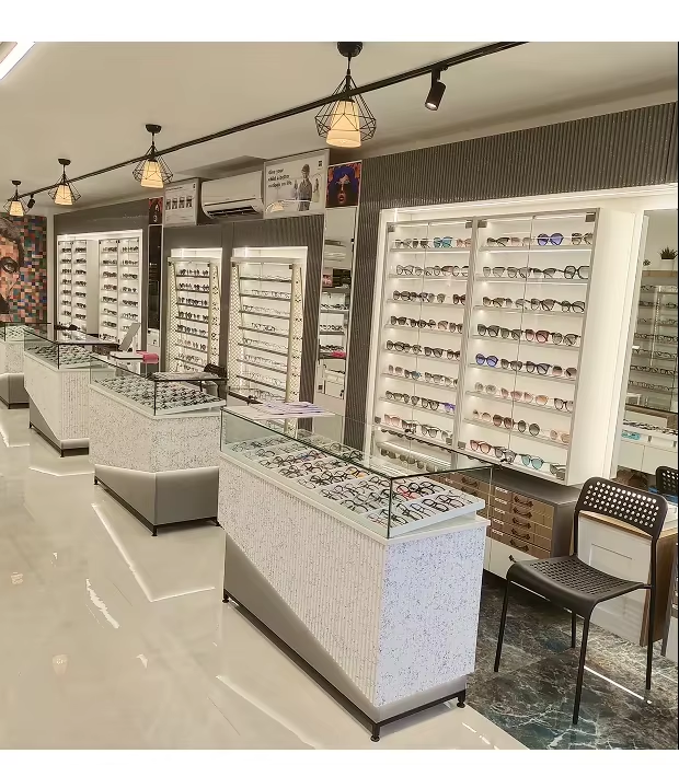 Conception intérieure personnalisée pour showroom optique : Aménagement élégant et fonctionnel pour magasin de lunettes, éclairage intelligent, mobilier d'exposition pour montures.