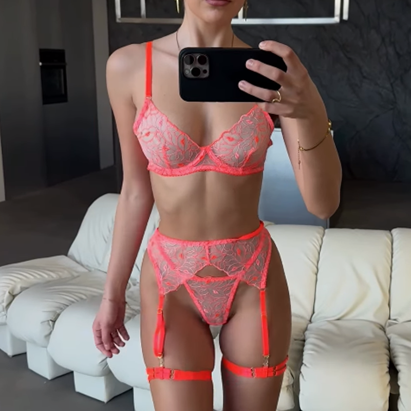 Ensemble de lingerie trois pièces personnalisé en dentelle transparente brodée avec des lèvres, best-seller international, sous-vêtements sexy pour femmes