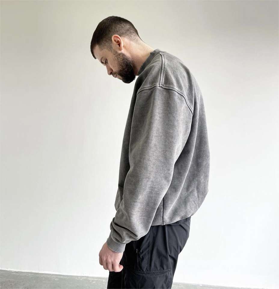 Sweat-shirt col rond surdimensionné personnalisé en molleton bouclette, effet délavé vintage et usé, avec ourlet et col vieillis