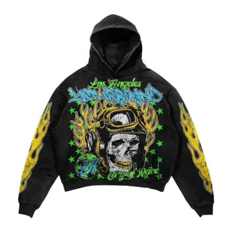 Hoodie court surdimensionné personnalisé brodé pour l'hiver, avec ourlet brut déchiré, impression DTG, qualité luxe, en molleton bouclette épais, délavé à l'acide