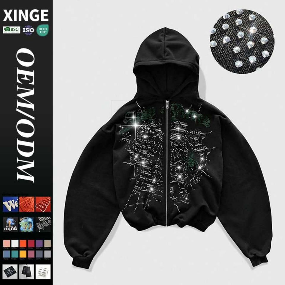 Sweat à capuche zippé pour homme, coupe oversize, imprimé graphique personnalisé en strass, style streetwear Y2K vintage, grammage lourd 400 g/m², épaules tombantes, coupe carrée