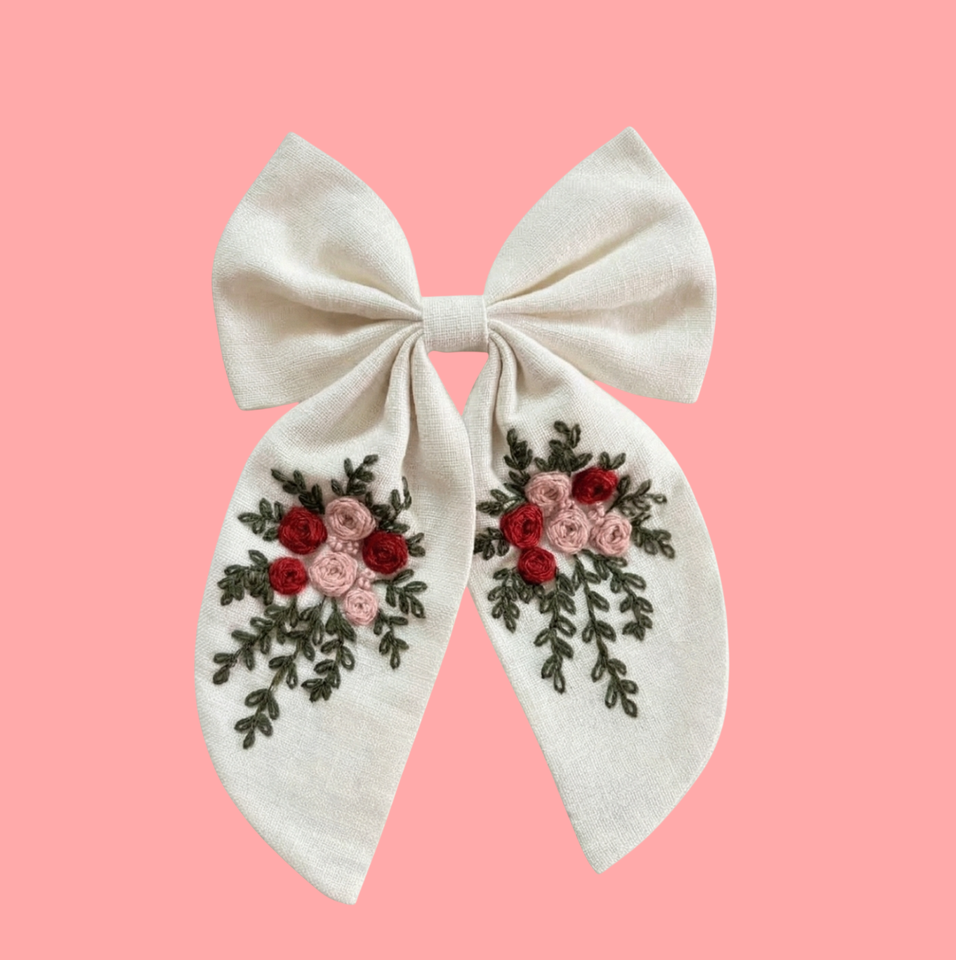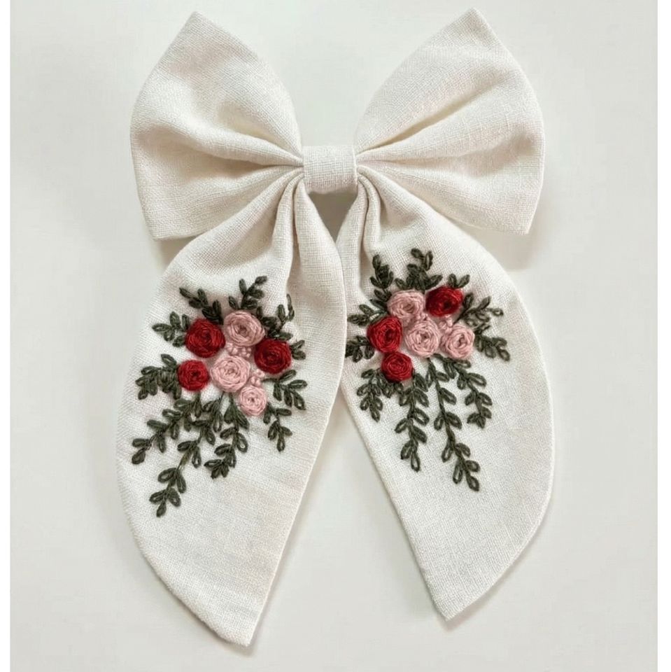 Barrettes à cheveux personnalisées surdimensionnées en lin blanc avec nœud marin et motif floral de roses rouges brodé à la main, à longue queue