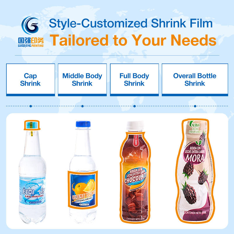 Emballage souple en PVC personnalisé, film rétractable, étiquette rétractable, manchon pour jus, boissons énergisantes, soda, bouteille en plastique rétractable