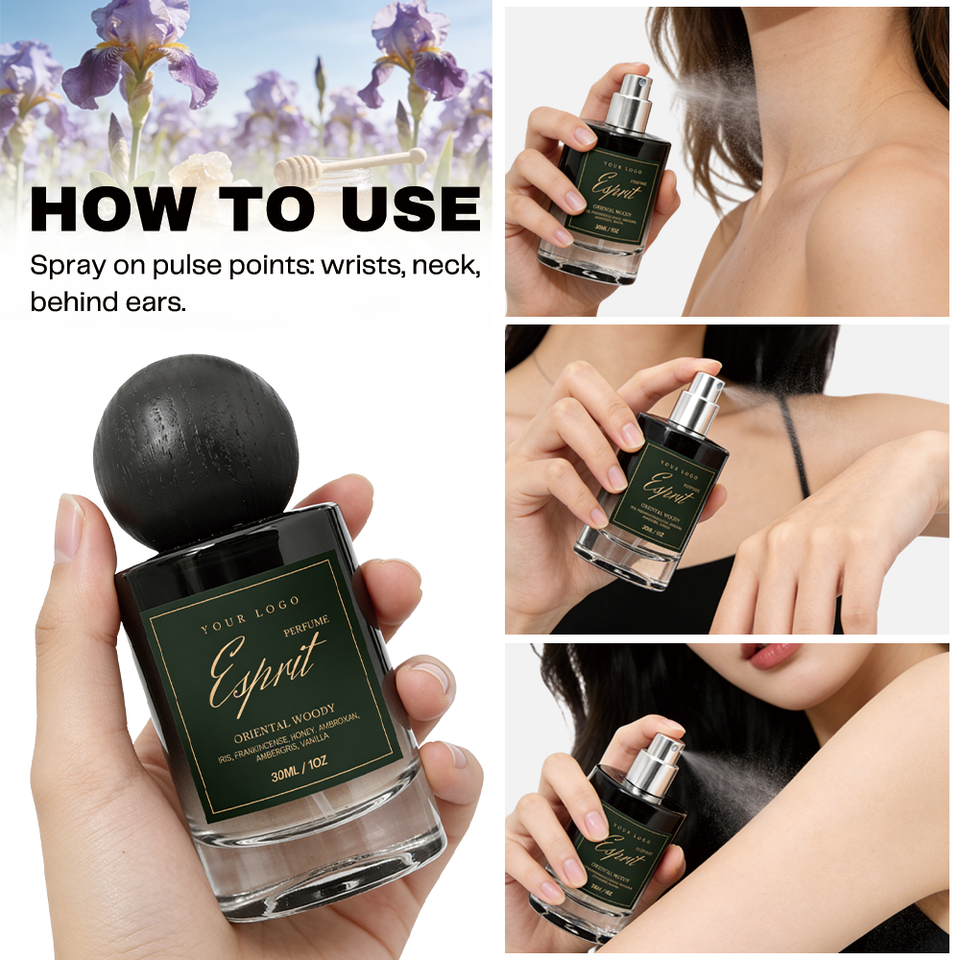 Emballage personnalisé, parfum pour homme 30 ml, romantique, longue tenue, iris, ambre gris, vanille, parfum oriental boisé, brume parfumée pour le corps, vaporisateur