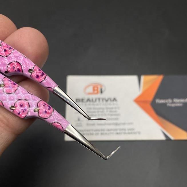 Pince à épiler professionnelle pour extensions de cils, en acier inoxydable, avec poignée robuste, pointe fine, personnalisable avec impression sur papier, fabrication pakistanaise, marque privée