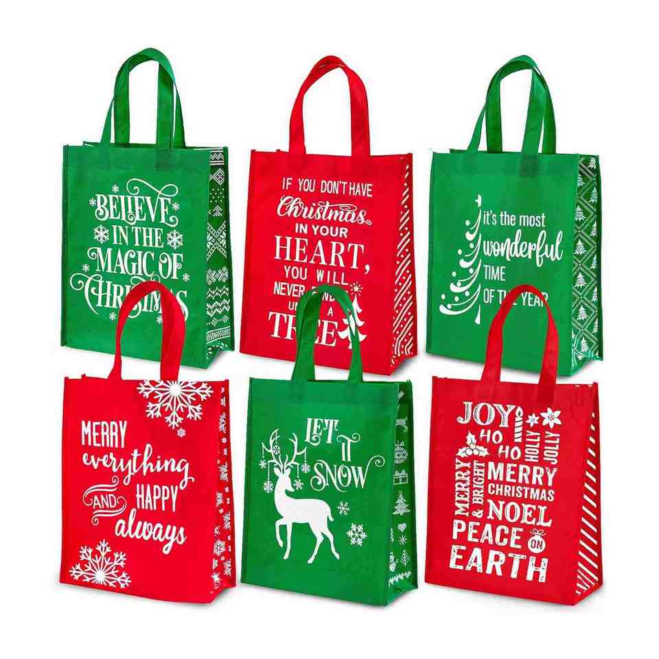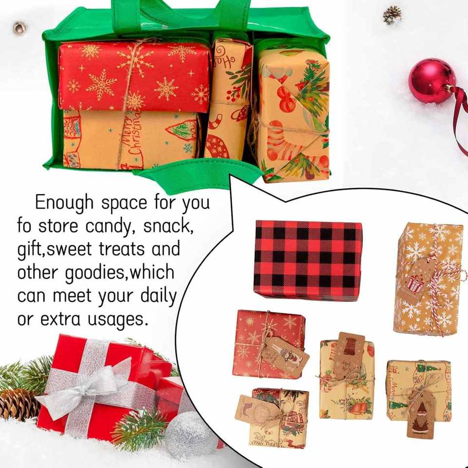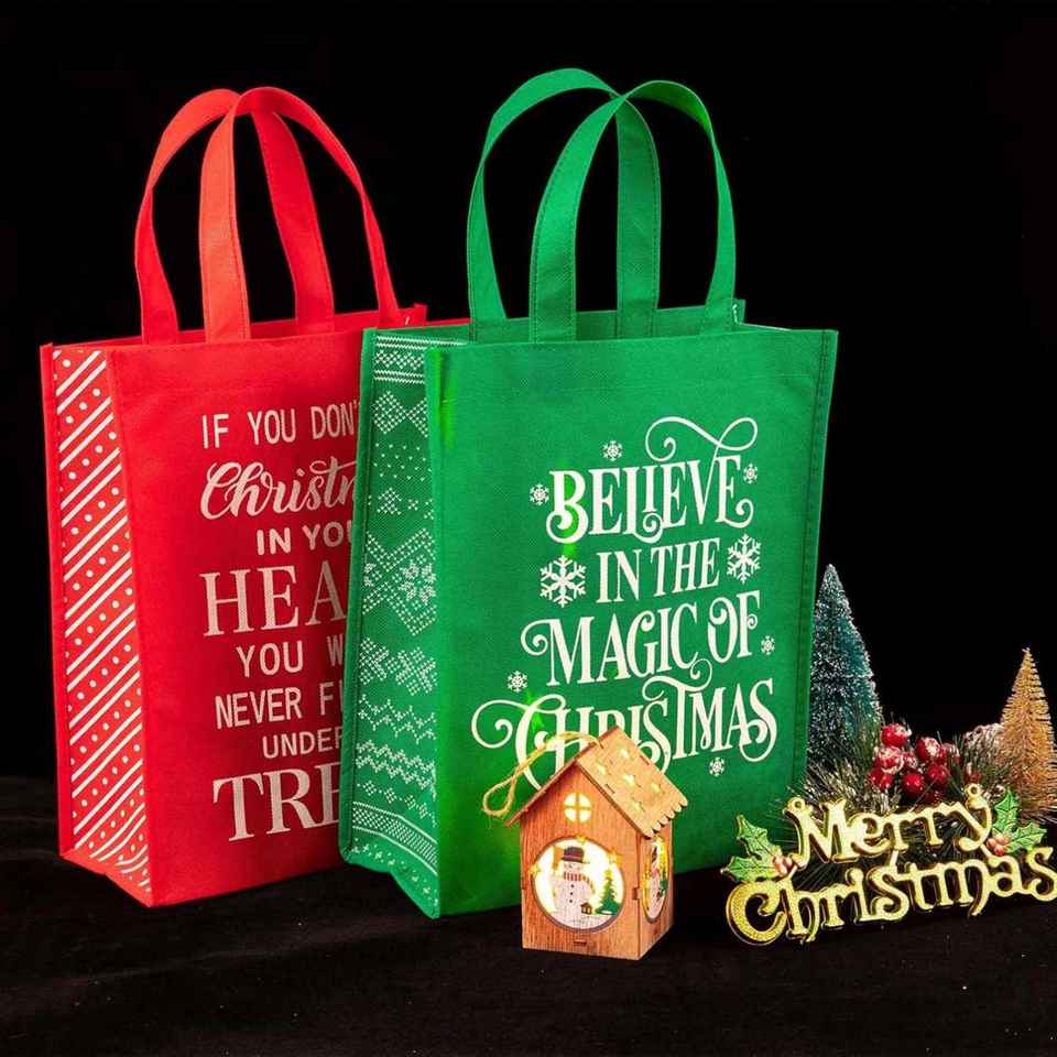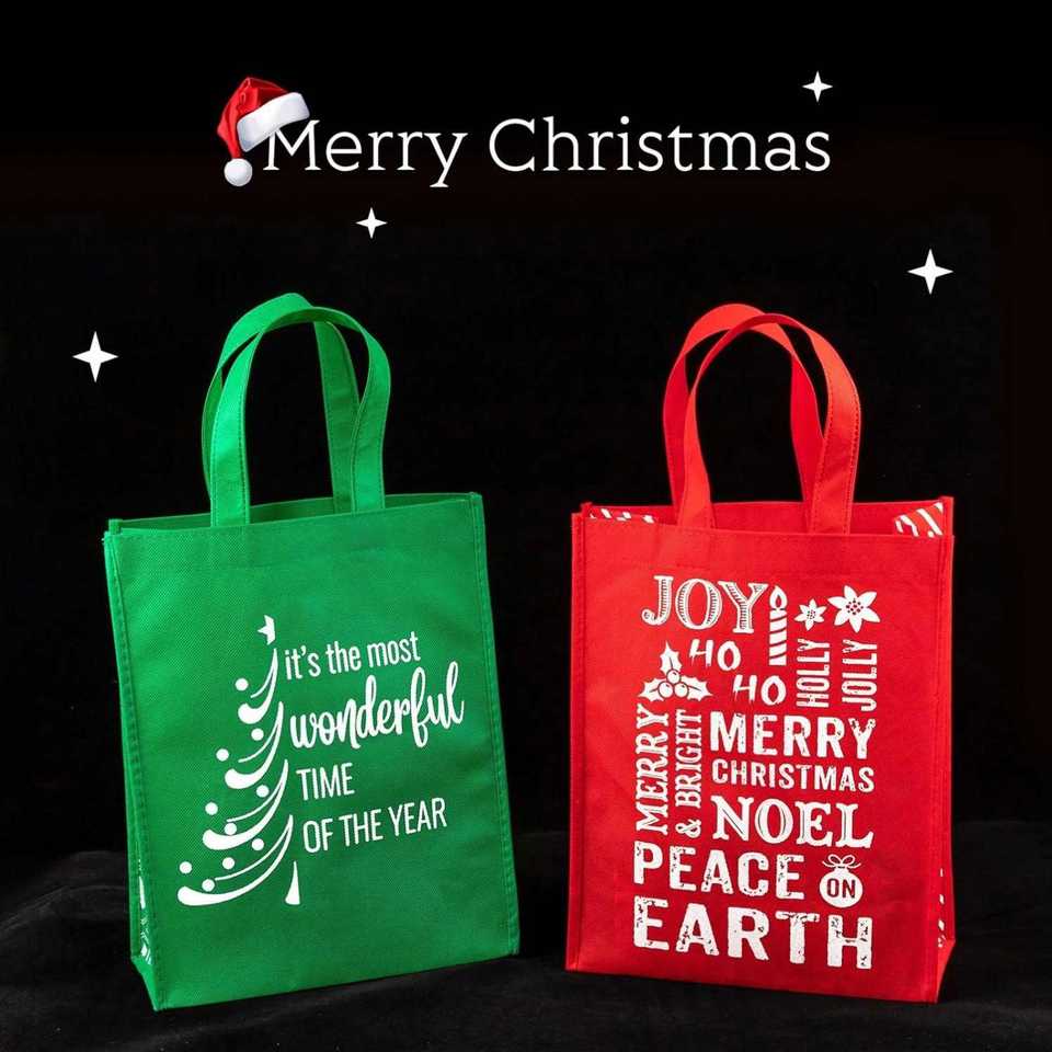 Sac fourre-tout réutilisable personnalisé pour fêtes, Noël, en non-tissé rouge et vert à flocons de neige, idéal pour cadeaux et courses quotidiennes