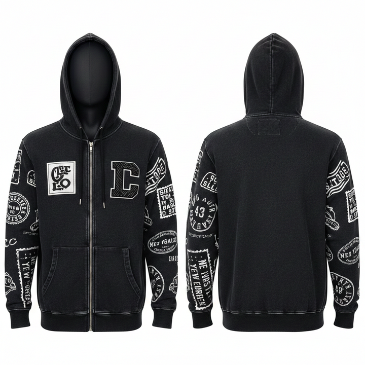 Sweat à capuche zippé avec broderie personnalisée, broderie coupée et cousue, sweat à capuche zippé court, délavé à l'acide, lourd, 2026