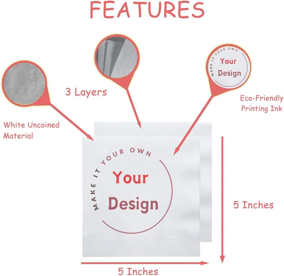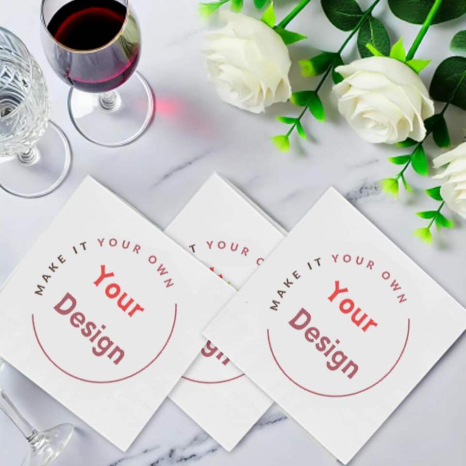 Serviettes de Cocktail Personnalisées en Papier Vierge 2 Plis pour Anniversaires et Mariages – 50 à 1000 Pièces avec Impression Photo et Logo sur Papier Téléchargeable