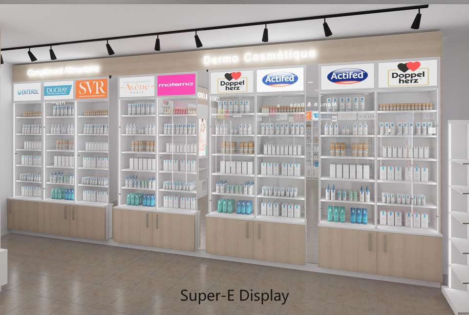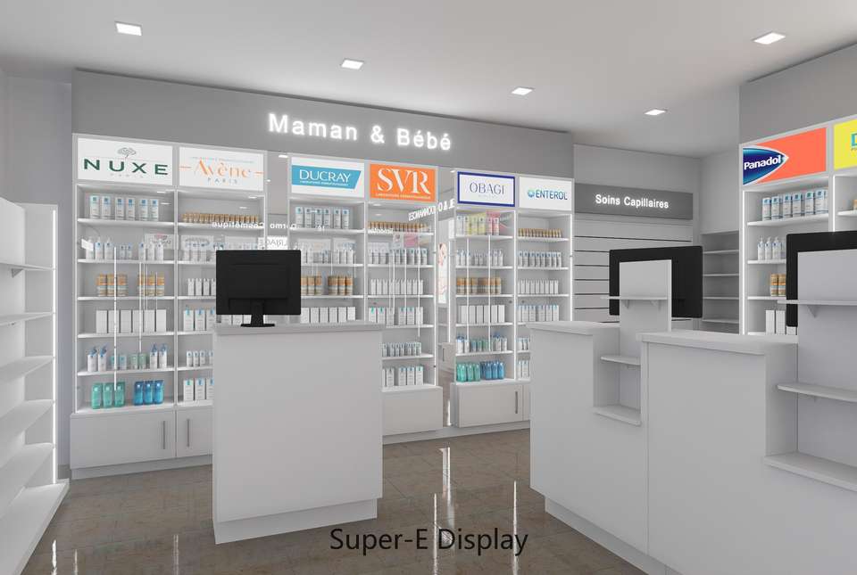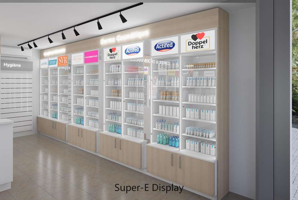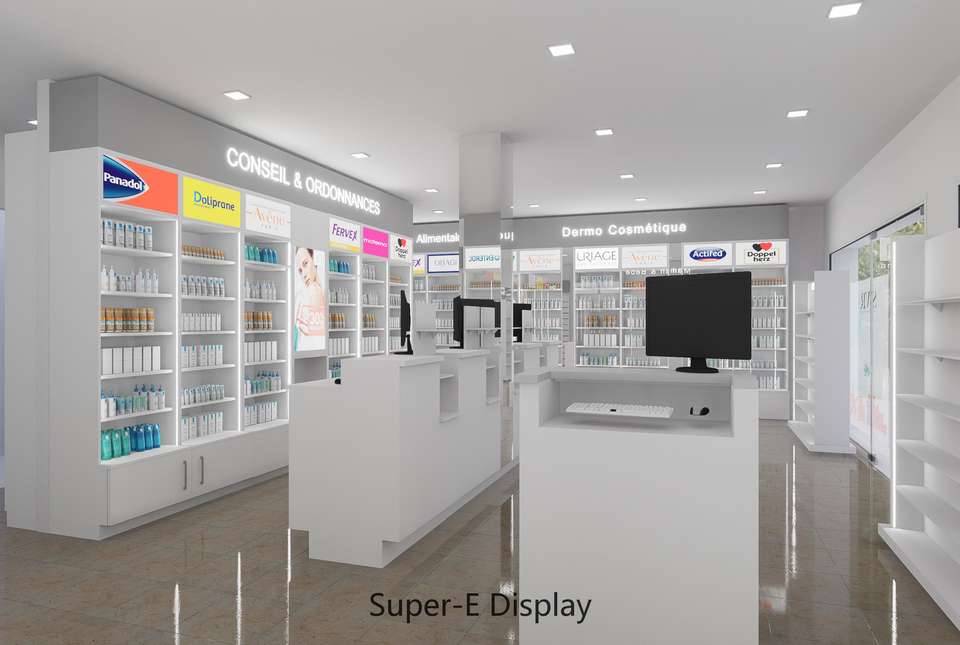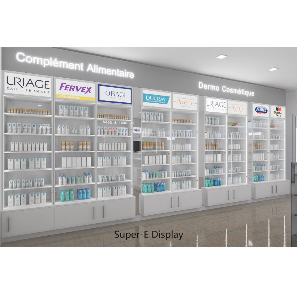 Custom Pharmacy Shelves Cosmetics Store Display Rack Medical Store Display Cabinet Interior Design