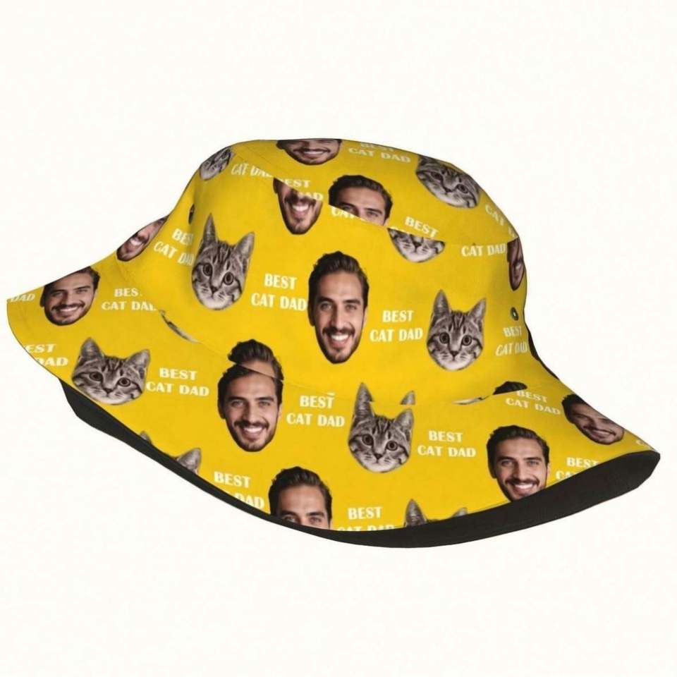 Chapeau Bob Personnalisé avec Photo et Visage Amusant, Motif Chat Dessiné à la Main, Bord Large, Respirant, pour Toutes Saisons et Usage Quotidien