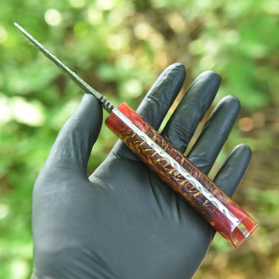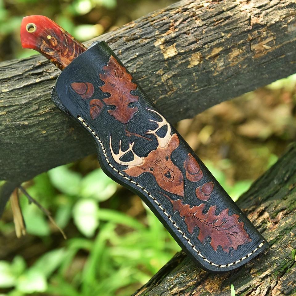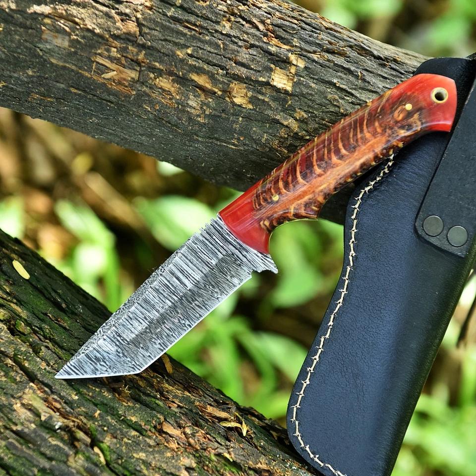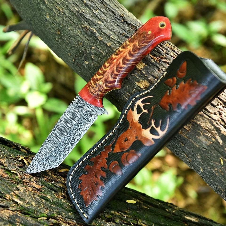 Couteau de chasse à lame fixe en acier Damas à cône de pin personnalisé, fait à la main avec étui en cuir, OEM pris en charge, nouveau design, couteau de cowboy