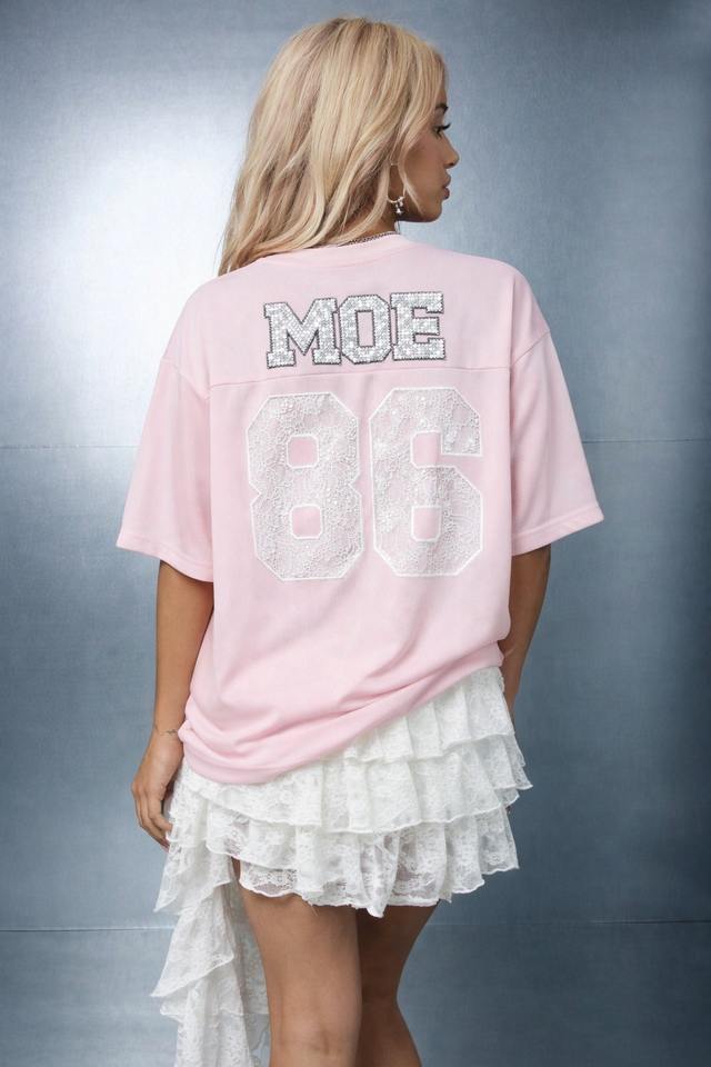 Maillot de football américain rose personnalisé avec lettres en strass et numéros en dentelle, col en V oversize, style streetwear, vente en gros aux États-Unis