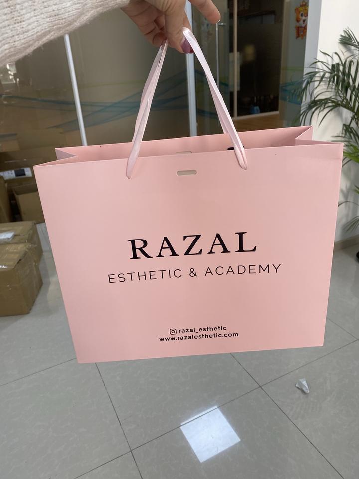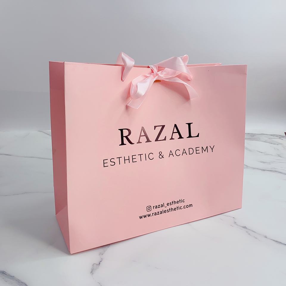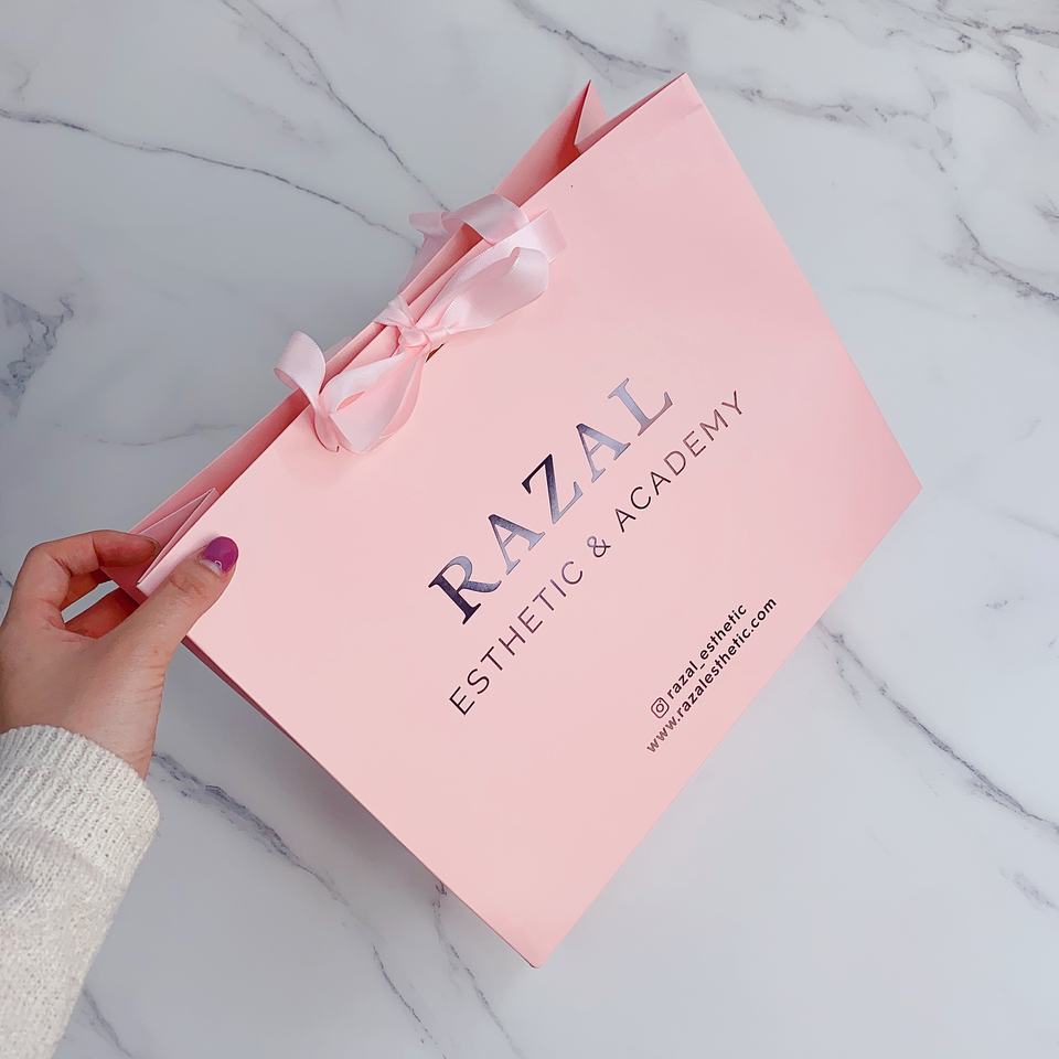 Sacs cadeaux en papier rose personnalisés avec estampage à chaud doré et poignées en ruban - Sacs de shopping de luxe pour boutiques