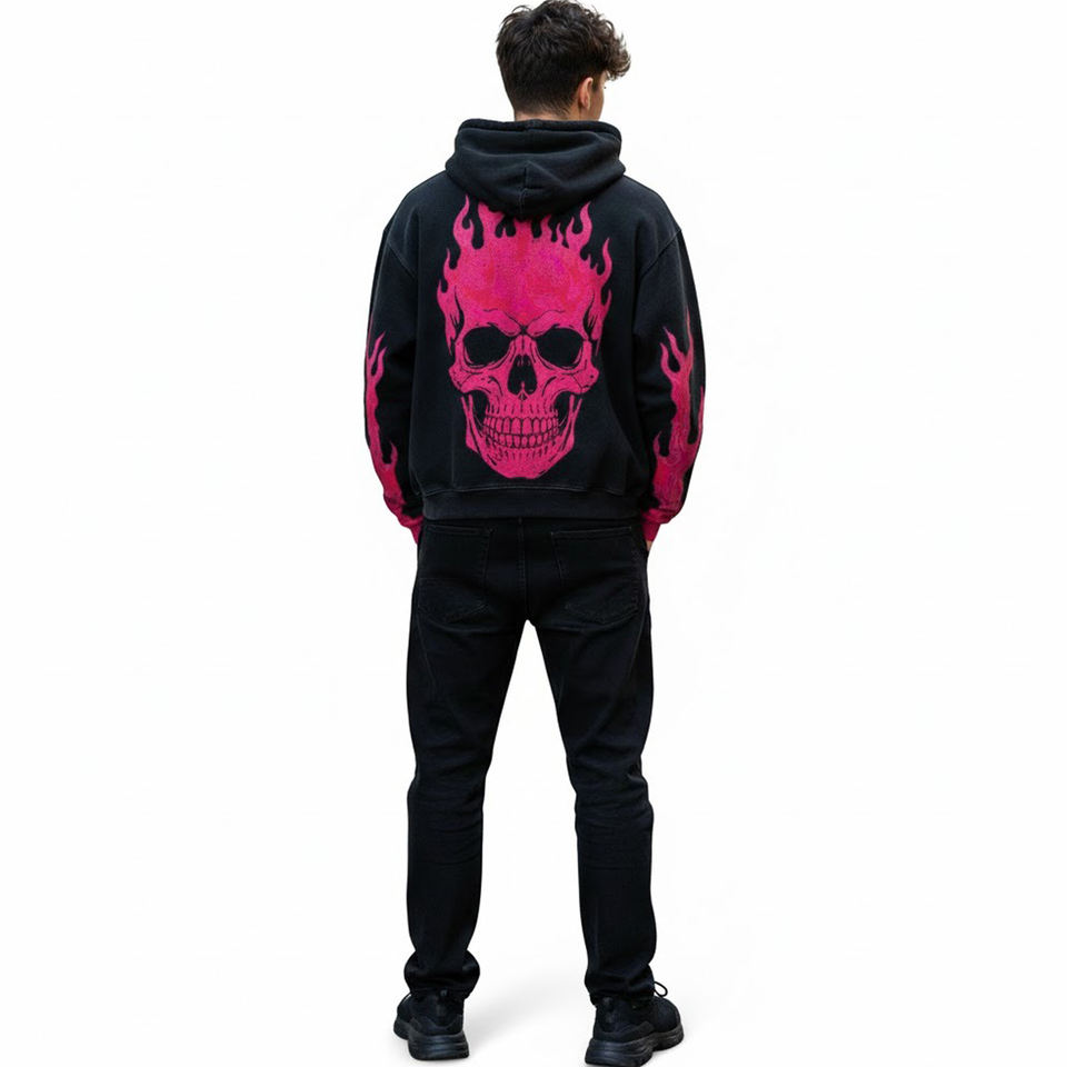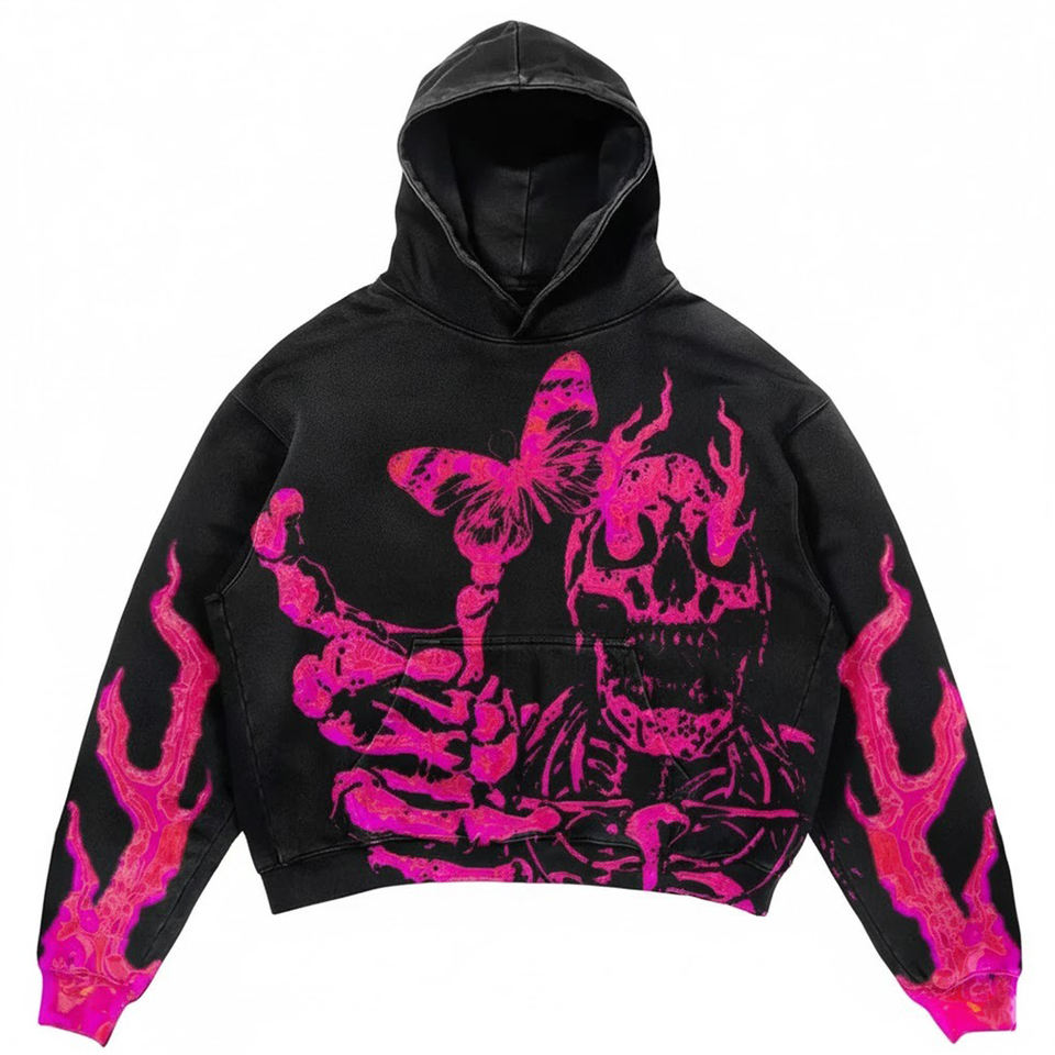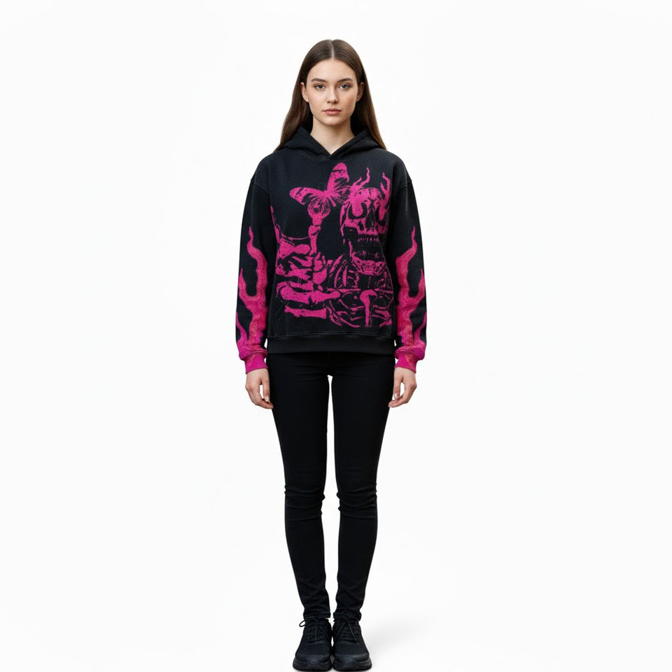 Sweat à capuche décontracté rose personnalisé avec motif tête de mort, papillon et flamme, style gothique streetwear hip-hop, 100% coton molletonné, écologique, coupe classique