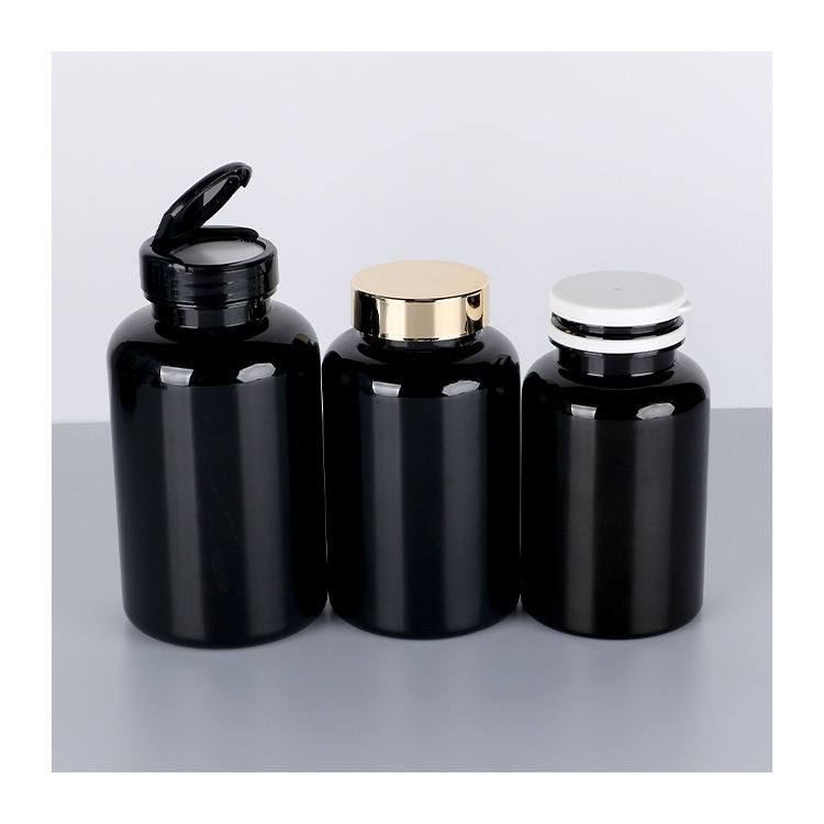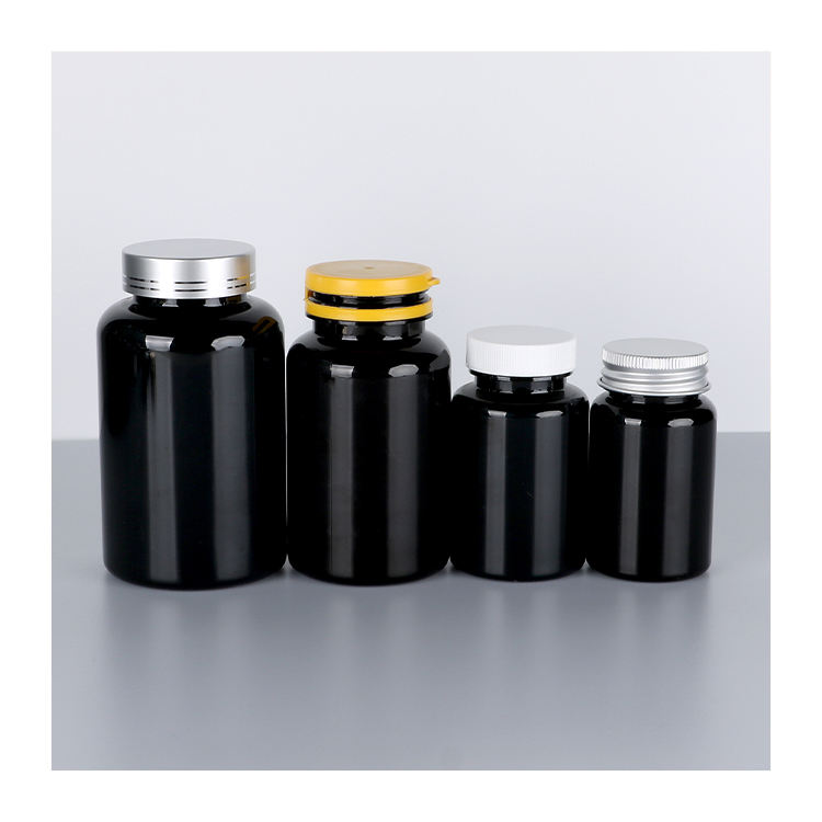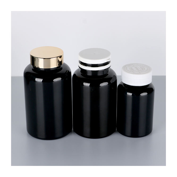 Bouteille de vitamine vide pour animaux de compagnie en plastique personnalisée bouteille de supplément de comprimé de capsule de pilule noire avec bouchon en aluminium doré 100ml 120ml 180ml