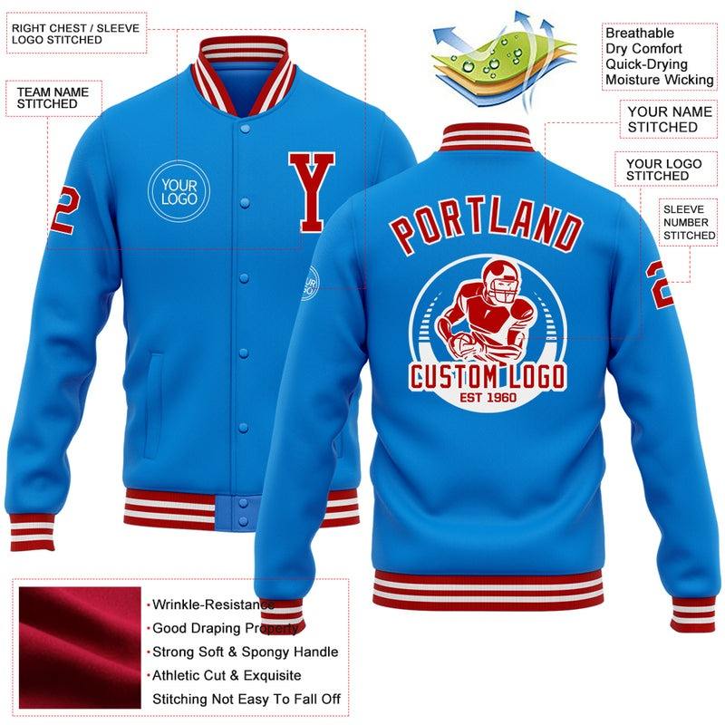 Veste universitaire personnalisée vintage à boutons-pression pour homme en bleu poudré rouge-blanc Bomber coupe-vent Streetwear pour l'hiver