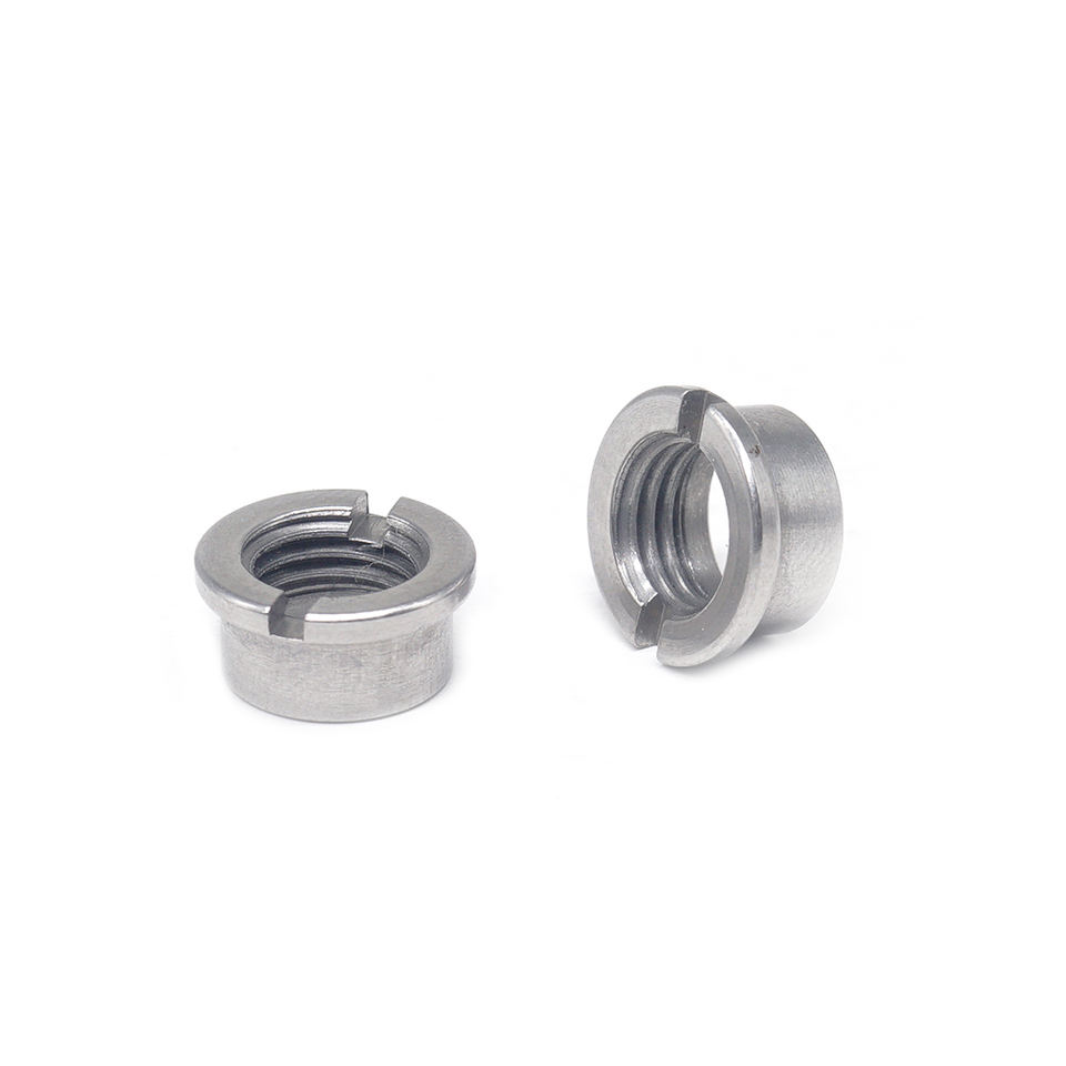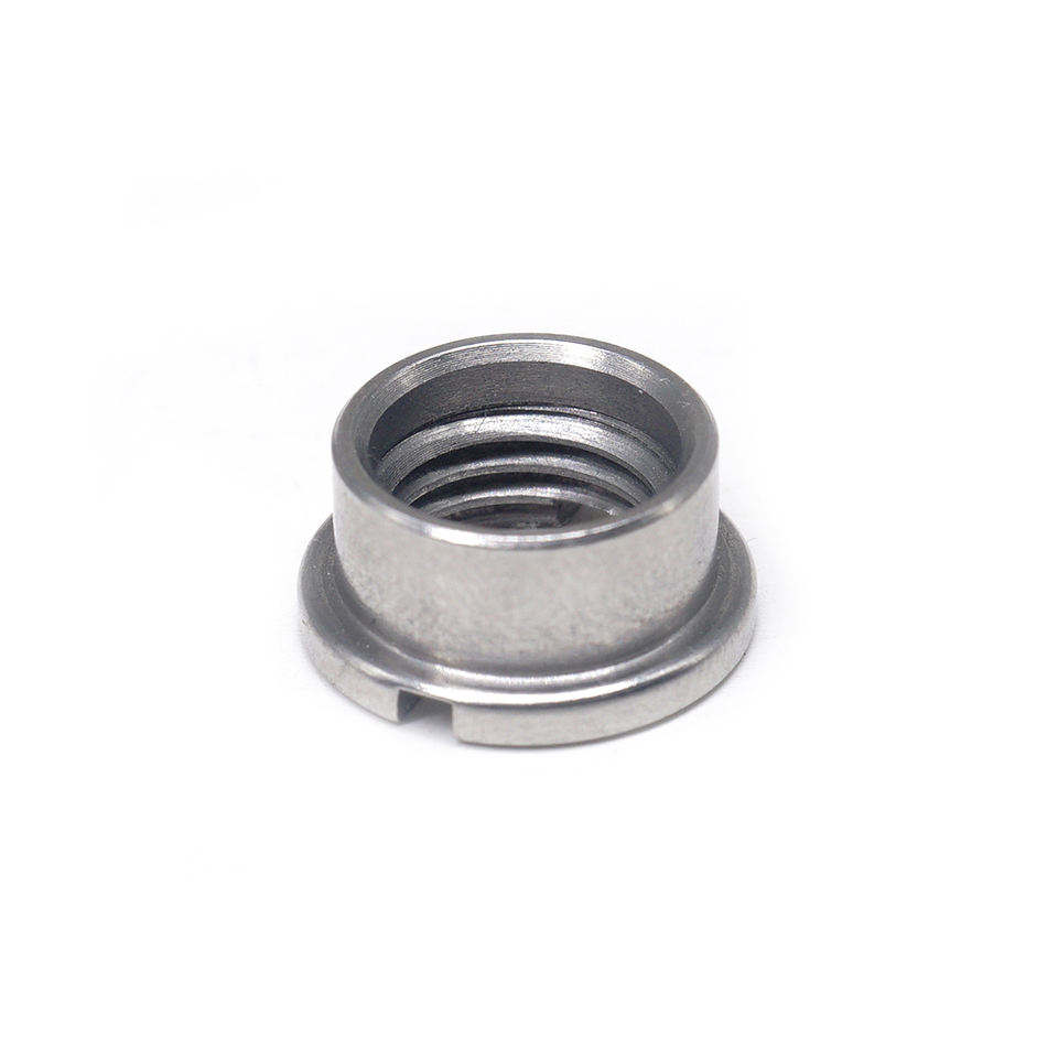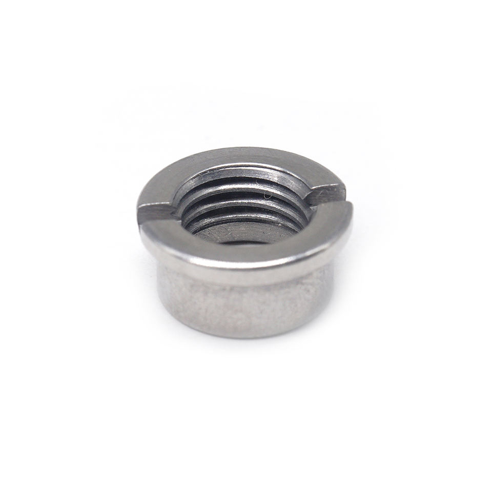 Écrou cylindrique en acier inoxydable poli, usiné avec précision, tête plate, centré, filetage interne