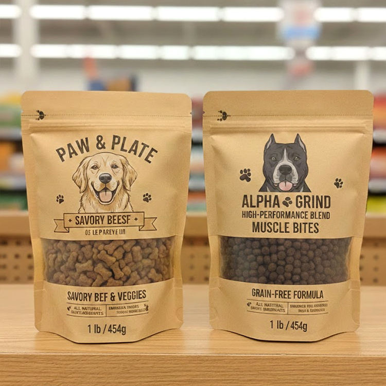 Pochette refermable écologique personnalisée pour aliments pour chiens, emballage pour friandises pour chats, sachet en papier kraft autoportant pour nourriture pour animaux de compagnie