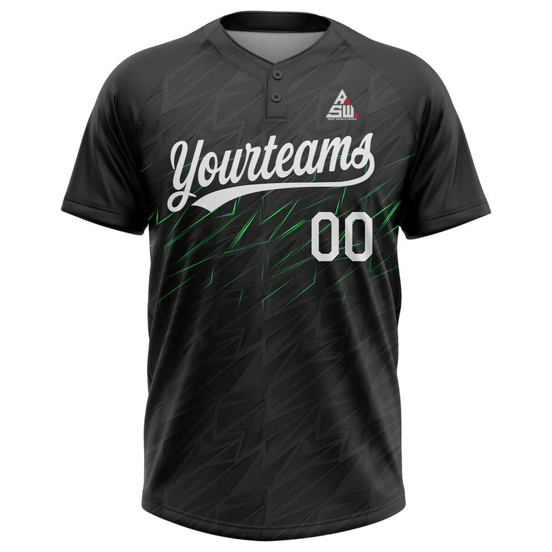 Maillot de baseball noir 100 % polyester imprimé sur mesure, antibactérien, avec lettrage doré, manches courtes, fermeture à boutons, pour équipe