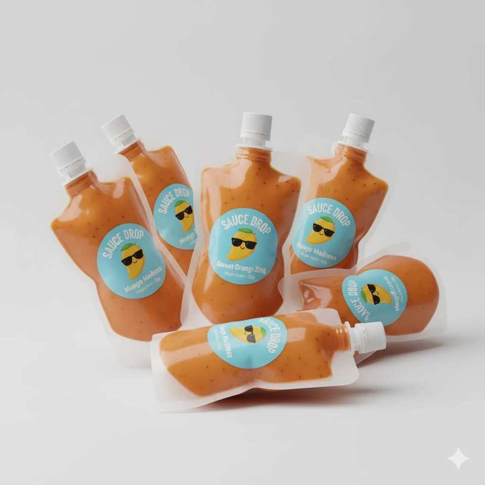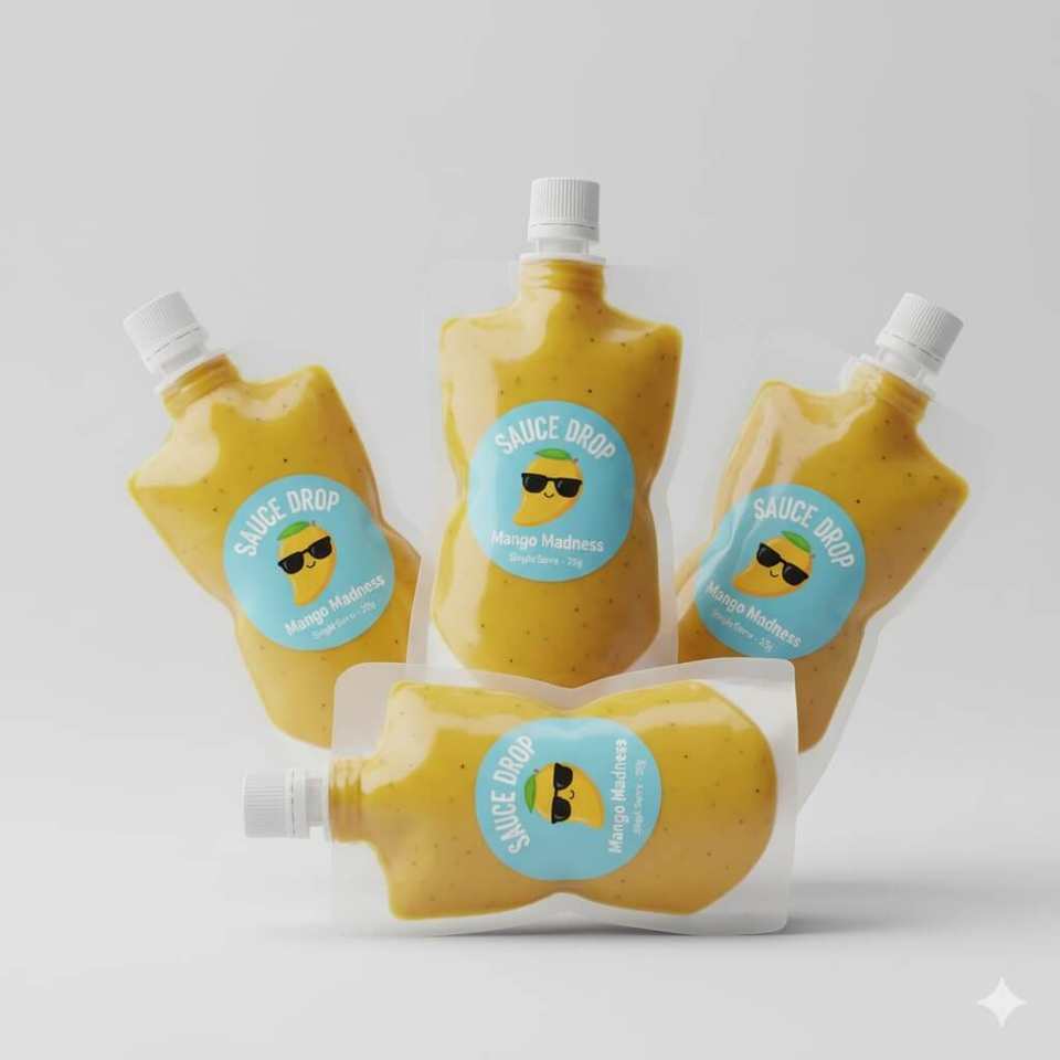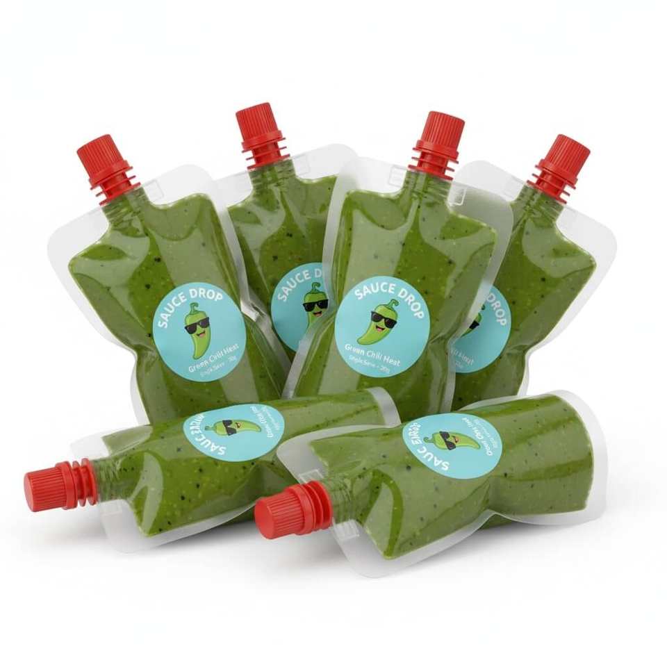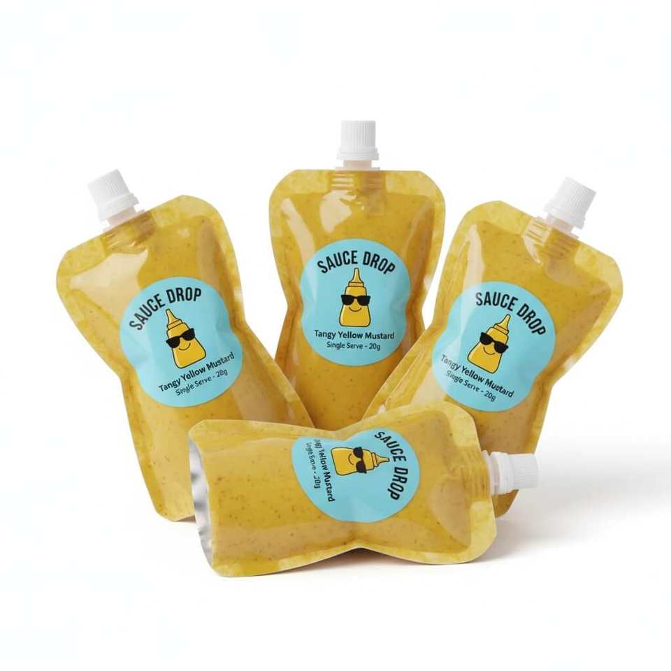 Sachet découpé en forme de bouteille imprimé sur mesure pour l'emballage individuel de ketchup, de moutarde et de sauces