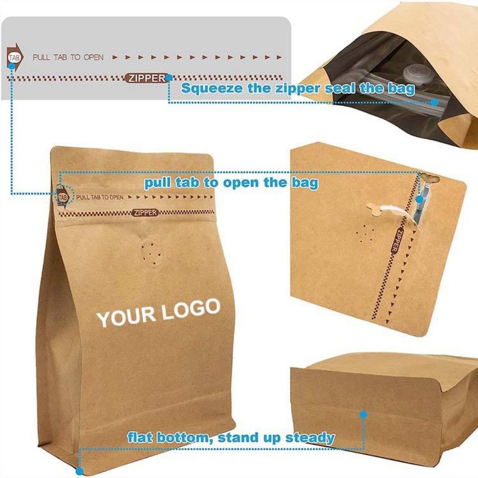 Sacs en papier kraft imprimés sur mesure à fond plat pour grains de café, emballage alimentaire en plastique avec valve, fermeture éclair et lien métallique – Fournisseur en Chine