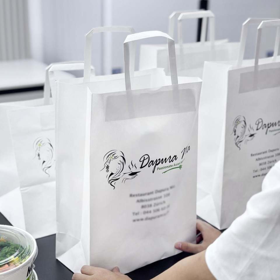 Sacs à emporter en papier kraft classique imprimés sur mesure, recyclables, avec poignées, pour restaurants asiatiques