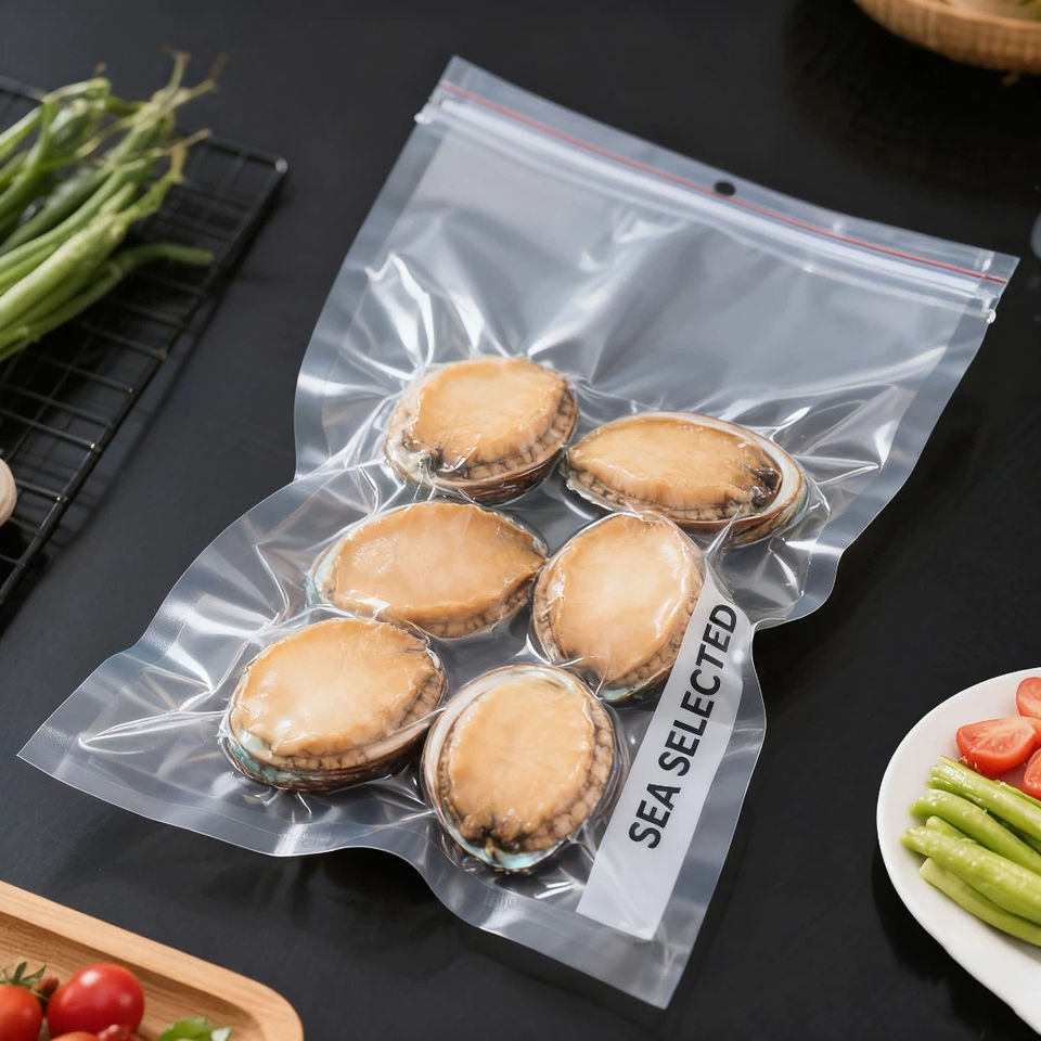 Sacs refermables en PE Mylar avec fond gousset, imprimés par gravure personnalisée, fenêtre transparente, pour fruits de mer frais, abalone, résistants à l'humidité