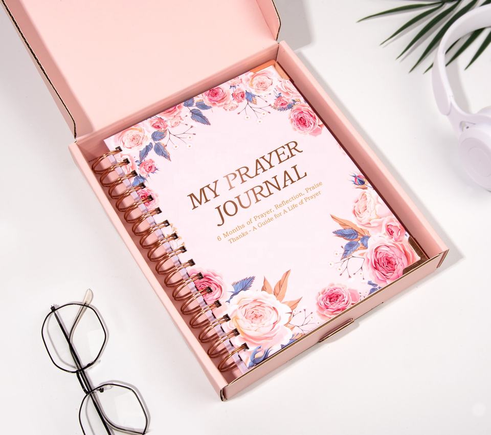 Journal de prière imprimé sur mesure planificateur de gratitude quotidienne coffret cadeau Libretas Agenda cahiers Journal carnet à spirale avec boîte cadeau