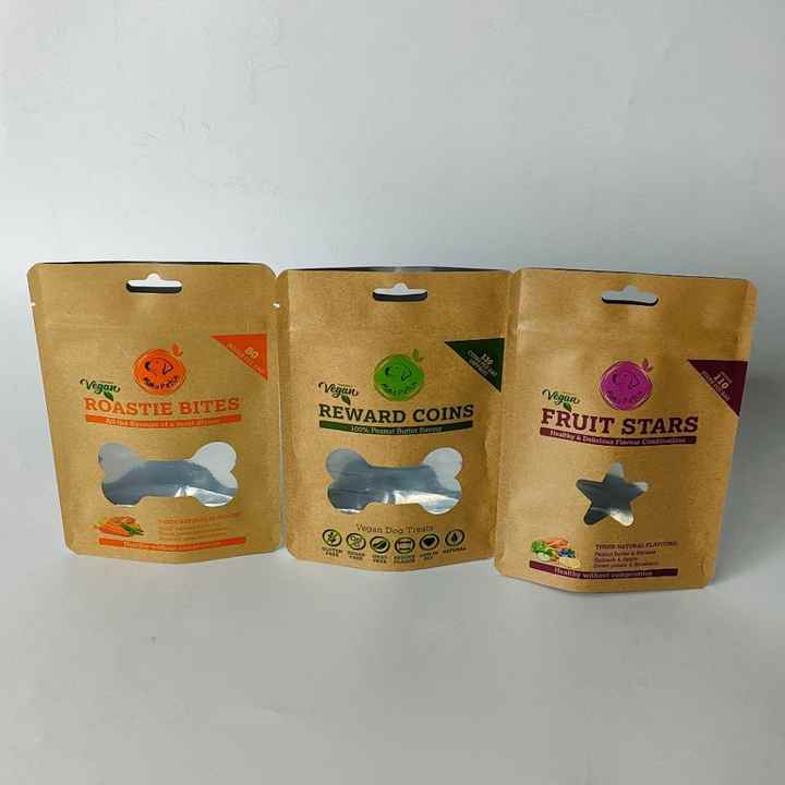 Sacs d'emballage en papier kraft refermables à fermeture éclair personnalisés avec fenêtre transparente pour les friandises pour chiens et les aliments pour animaux de compagnie