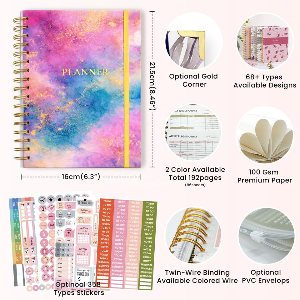 Disposition:Ligne / Grille / Pointillé / Pages vierges / Planificateur quotidien / Planificateur hebdomadaire